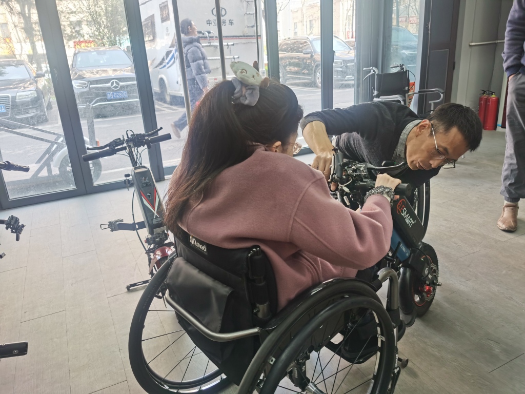 这样的场景,在店里早已是常态。于文涛说,普通量产轮椅看似通用,实则问题多多,宽度不合适、靠背角度不对,长期使用不仅不舒服,还可能导致脊柱侧弯。因此,店里主打轮椅定制适配,根据每位残障朋友的身高、体重、胯宽,甚至轮椅操作技巧量身打造,从靠背角度到踏板材质,从轮毂选择到刹车设计,每个参数都精准匹配。