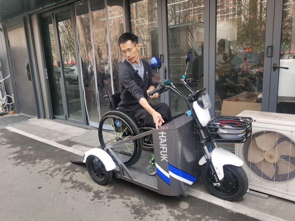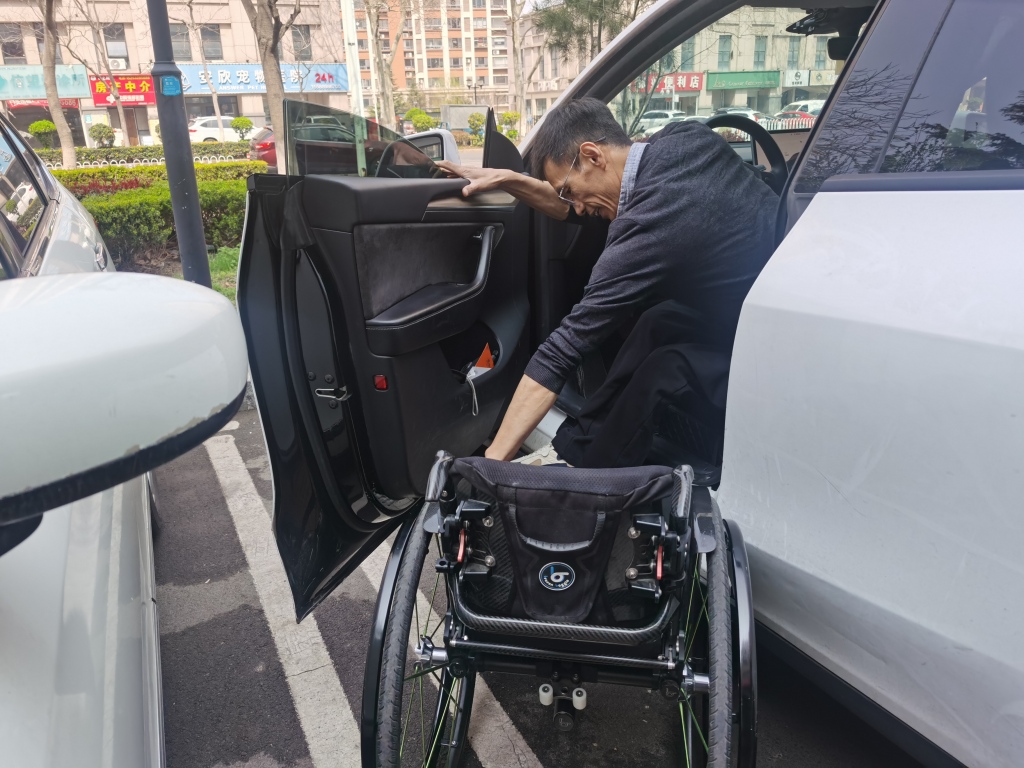 于文涛向记者展示上车及轮椅折叠步骤