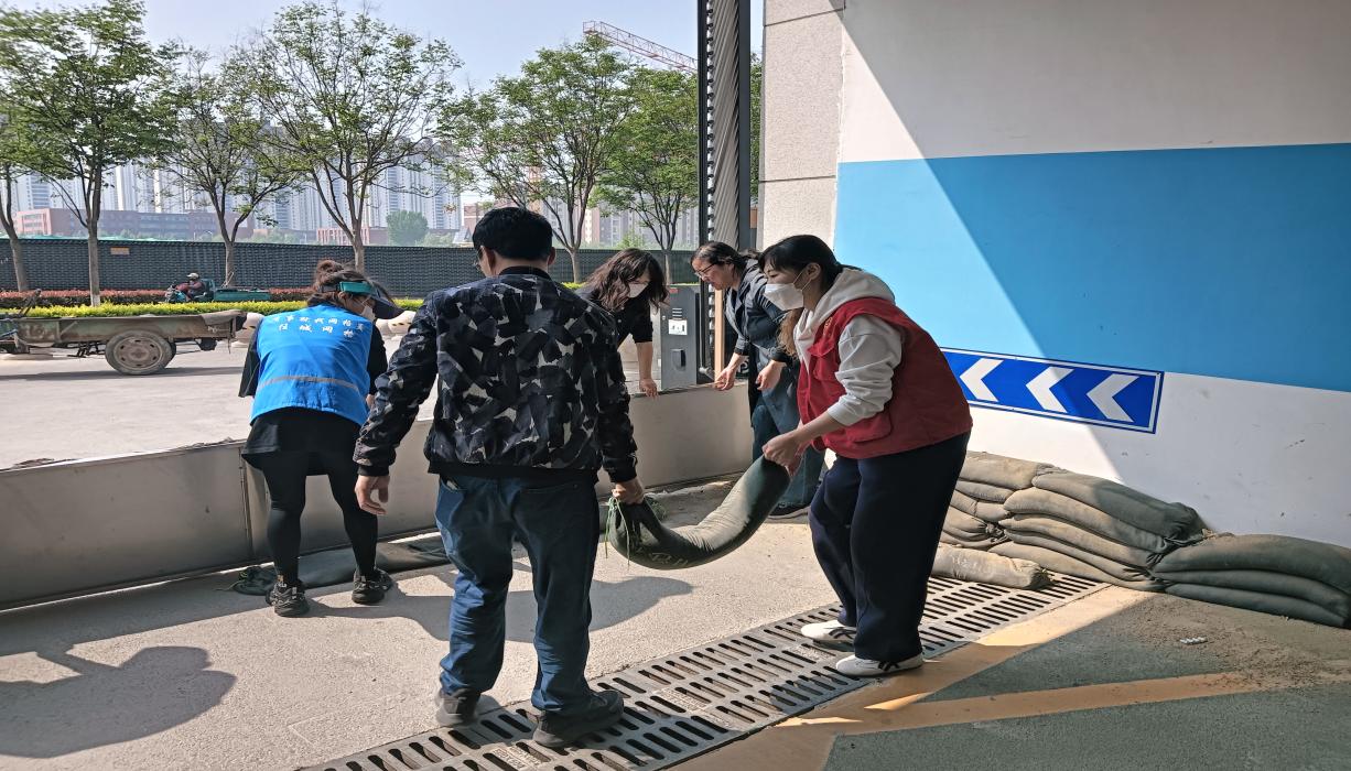 活动现场,社区同步启动应急预案,联合物业工作人员在小区地库低洼地段、积水区域搭建防汛围挡,针对车辆疏散、防汛沙袋封堵、防止雨水车库倒灌等关键环节展开实训。通过模拟极端雨情下的应急响应,社区网格员、巾帼志愿者与物业人员分工协作,圆满完成各项演练任务。