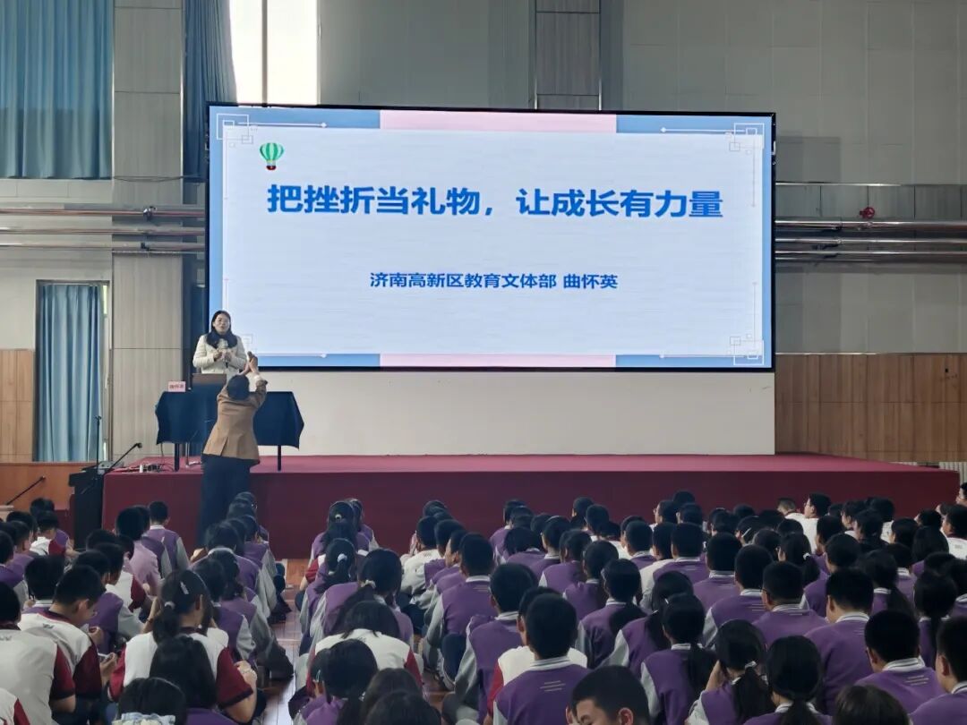 为引导学生正确认识挫折、提升心理韧性,4月16日,济南高新区第一实验学校七年级邀请济南高新区心理教研员曲怀英老师,为全体学生带来了一场以“把挫折当礼物,让成长有力量”为主题的抗挫力教育专题讲座。