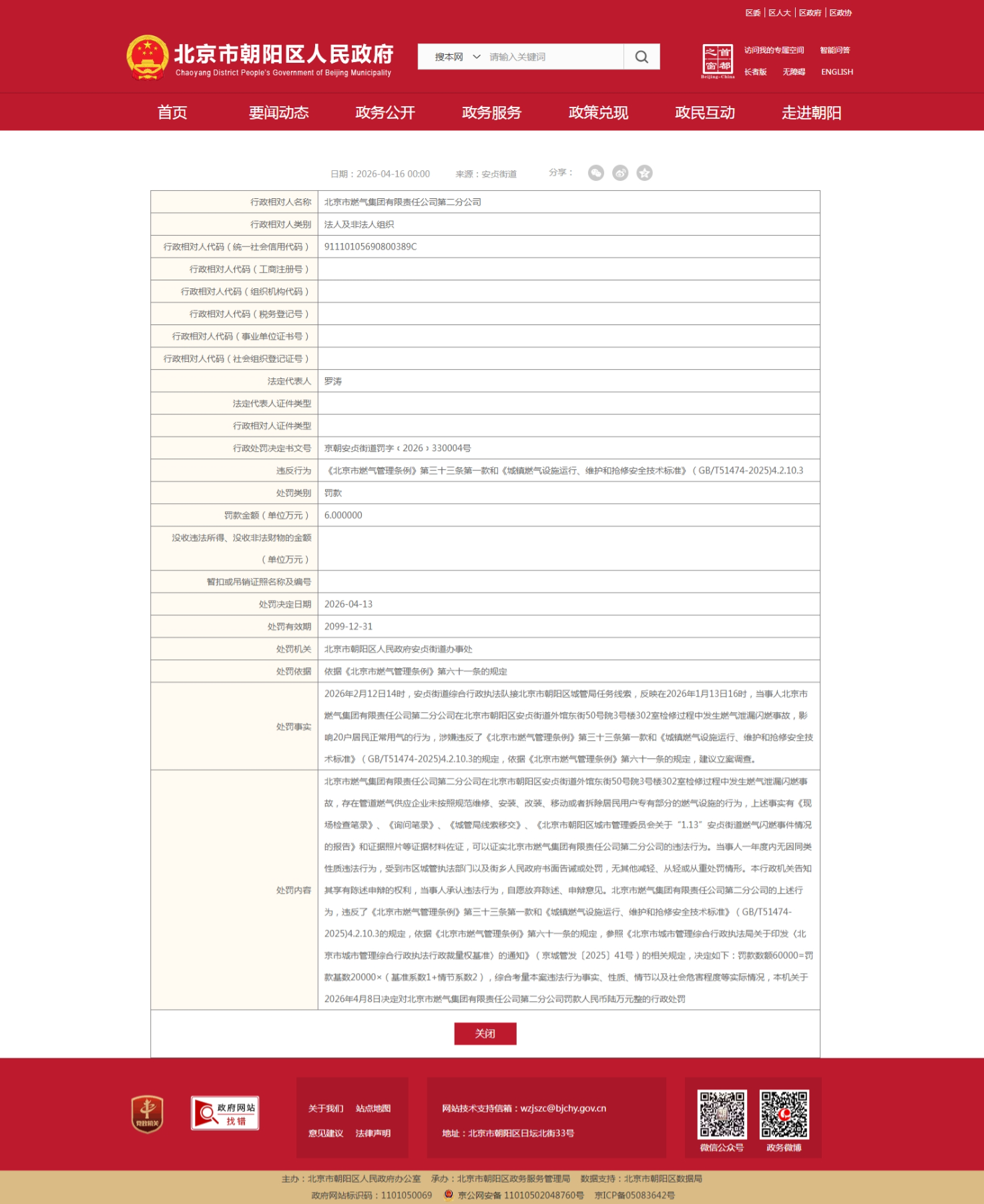 齐鲁晚报·齐鲁壹点记者于北京市朝阳区人民政府官方网站获悉,4月13日,北京市燃气集团有限责任公司第二分公司(下称“北京燃气集团第二分公司”)因一起燃气泄漏闪燃事故被行政处罚,处罚机关是北京市朝阳区人民政府安贞街道办事处。