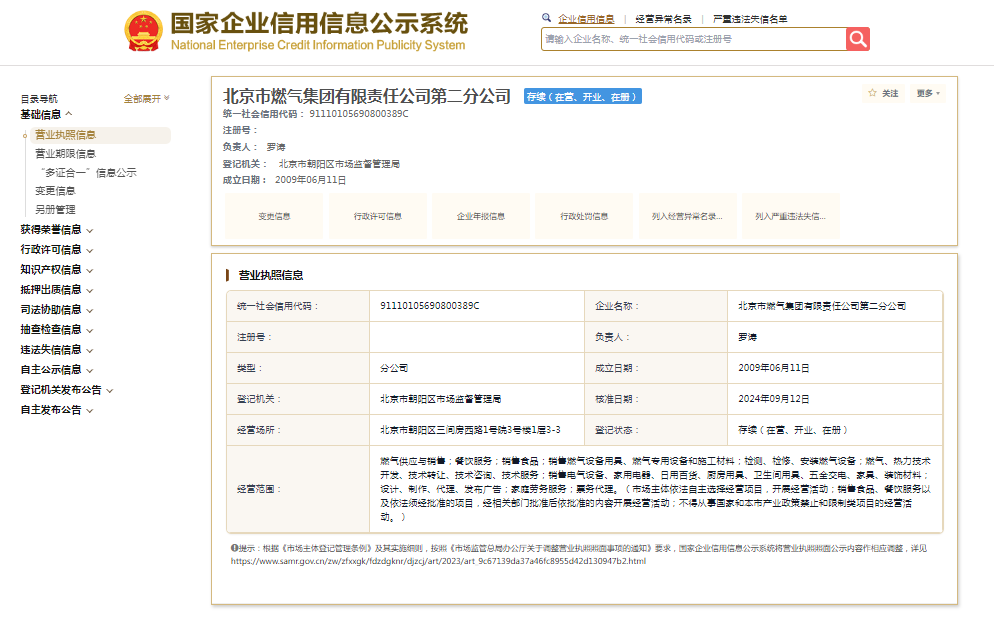 国家企业信用信息公示系统显示,北京市燃气集团有限责任公司第二分公司成立于2009年,负责人罗涛。其母公司——北京市燃气集团有限责任公司成立于2006年,注册资本588363万元人民币,法定代表人为冯军。