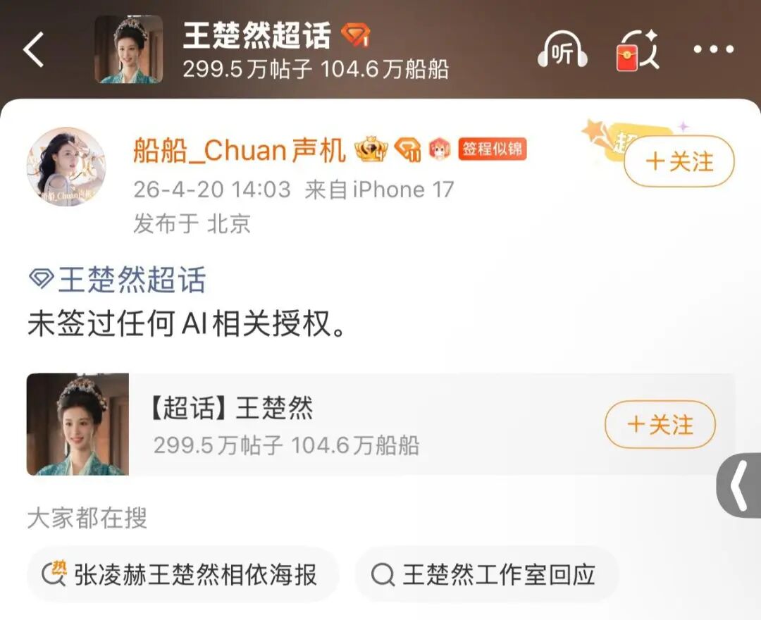 20日14:03,隶属于王楚然官方后援会的账号“船船_Chuan声机”在王楚然超话发布信息:“未签过任何AI相关授权。”