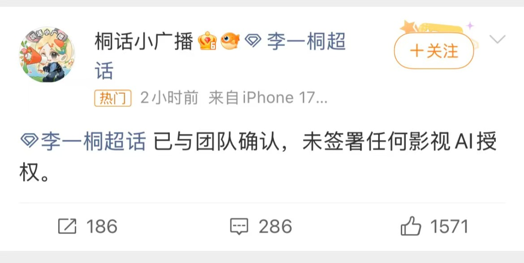 20日14:07,账号“桐话小广播”发文称与团队确认,未签署任何影视AI授权。