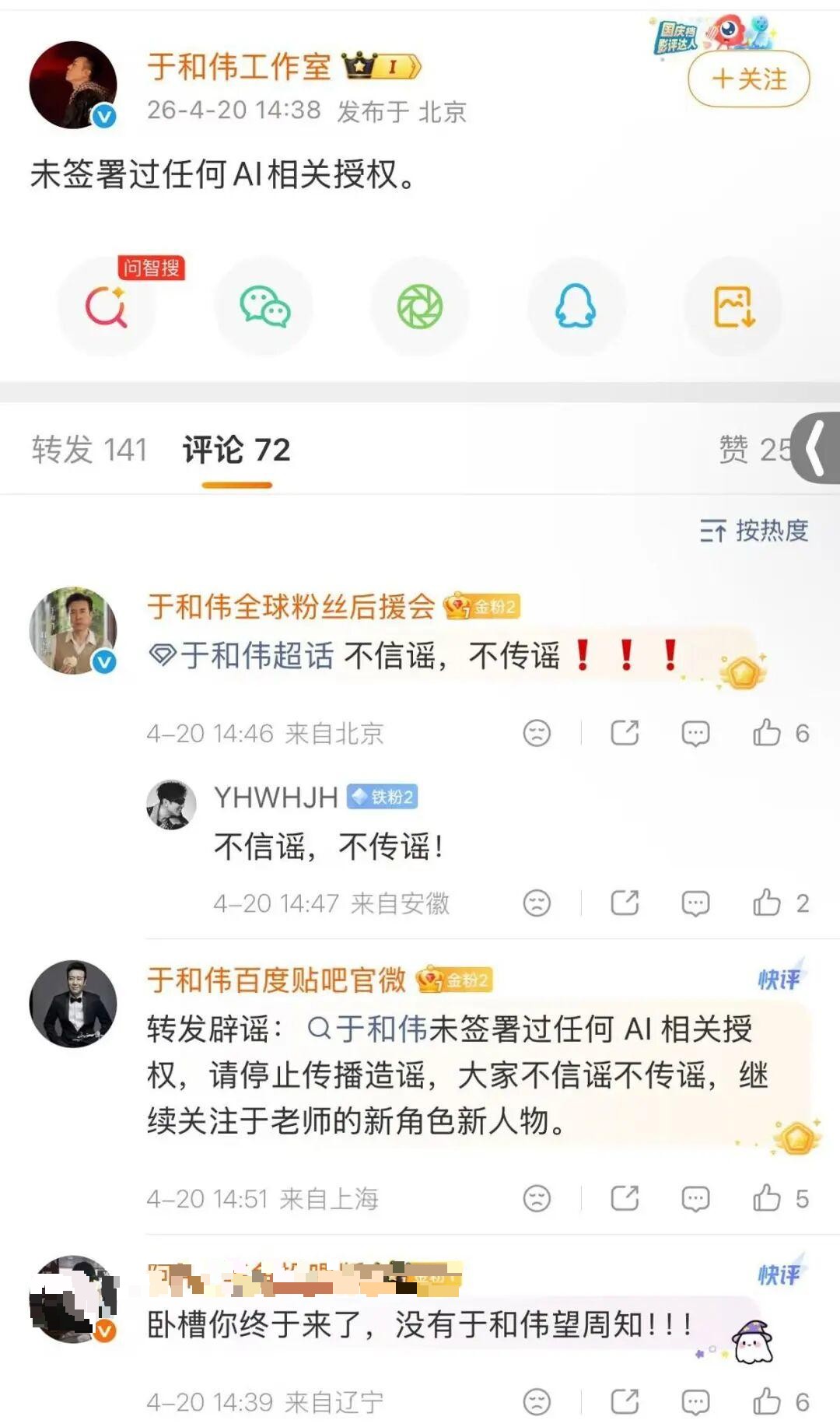 20日14:38,于和伟工作室发布简短声明:“未签署过任何AI相关授权。”