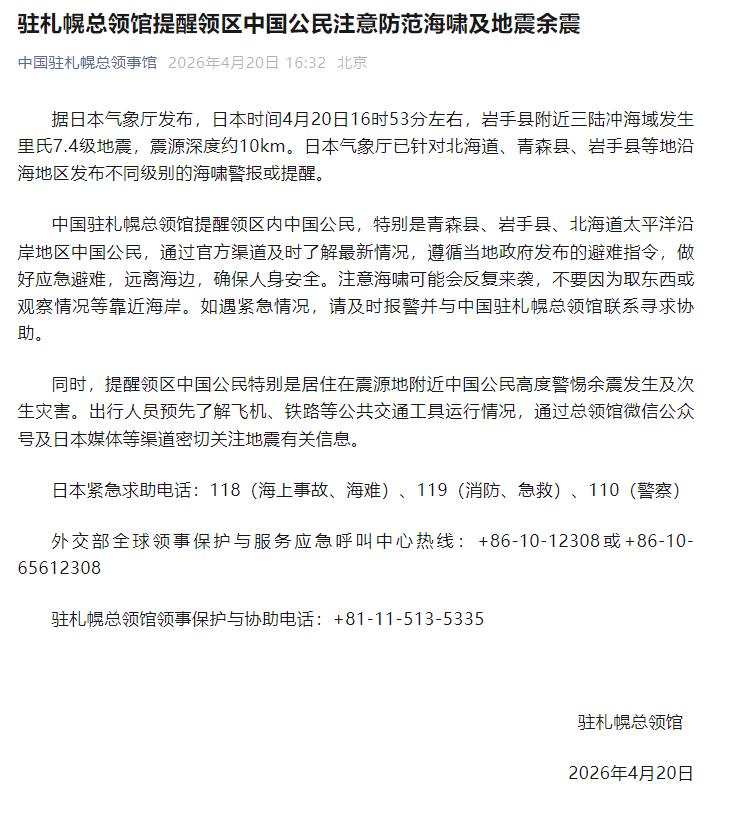 中国驻札幌总领馆:提醒领区中国公民注意防范海啸及地震余震