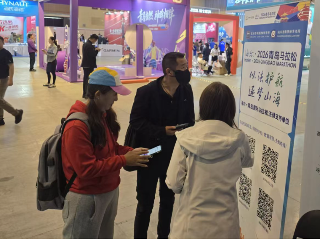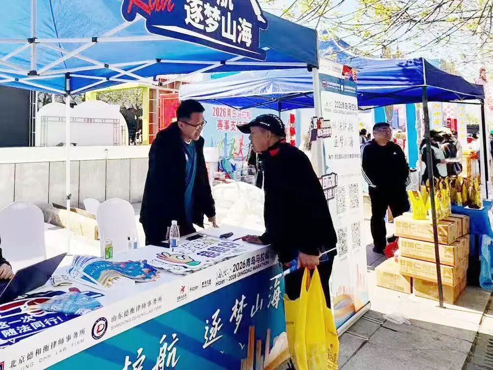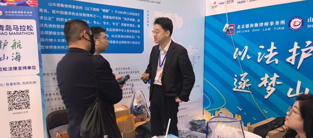 4月17日—19日,德和衡、德衡在青岛会展中心与海信广场马拉松终点处设立法律服务互动展位,一站式完成战队物资发放。现场设置普法宣传、法律知识竞答、“法言法语”互动游戏等环节,吸引众多选手打卡参与,让法律知识更接地气。