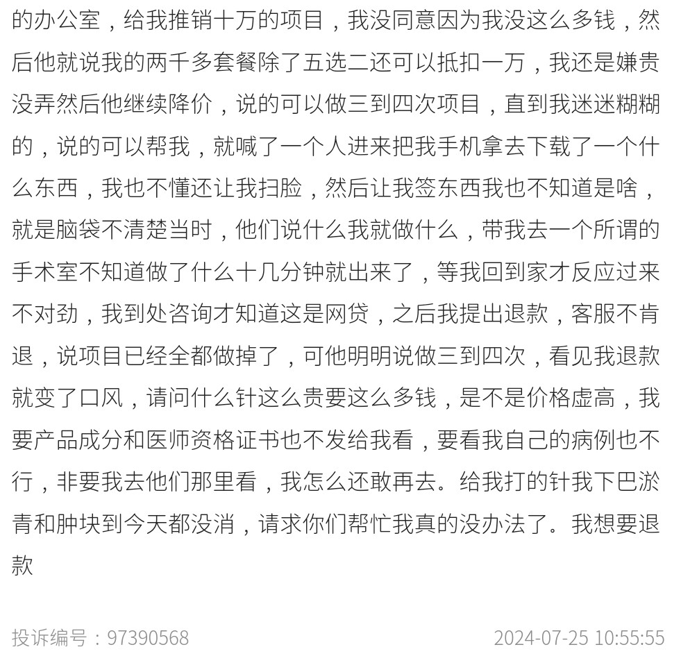 该消费者还提到,对方拿走了她的手机,下载了不明应用程序,让她扫脸并签署了文件。随后她被带至所谓手术室,接受了大约十几分钟的项目操作。回家后该消费者意识到自己办理了网贷。她提出退款要求,客服拒绝退款,称项目已经全部做掉了。