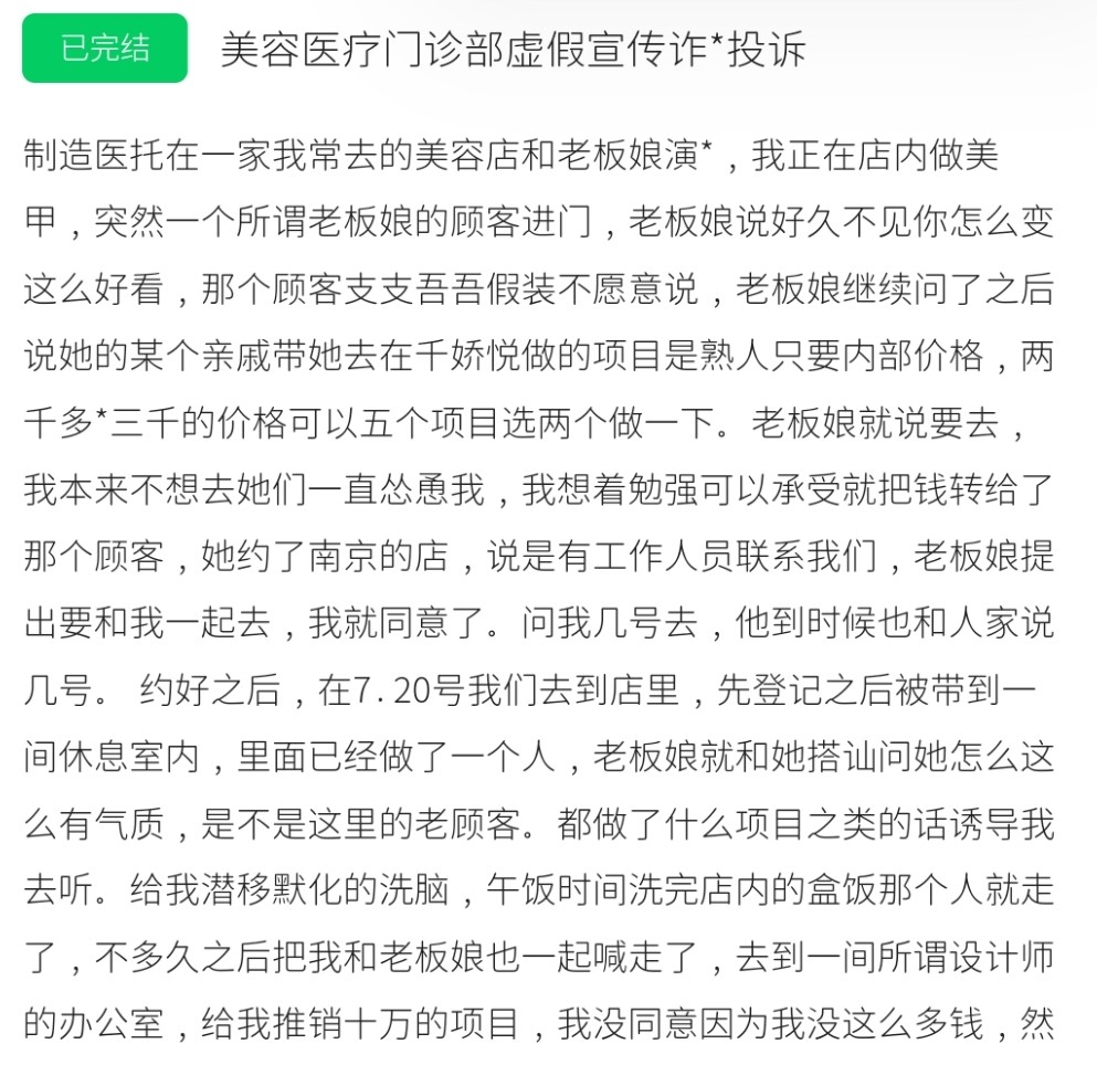 如果将时间轴拉长观察千娇悦医疗美容在多个投诉平台和政务留言板上均有类似的消费投诉,2024年7月25日,有消费者反映其在常去的美容店遭遇医托套路。
