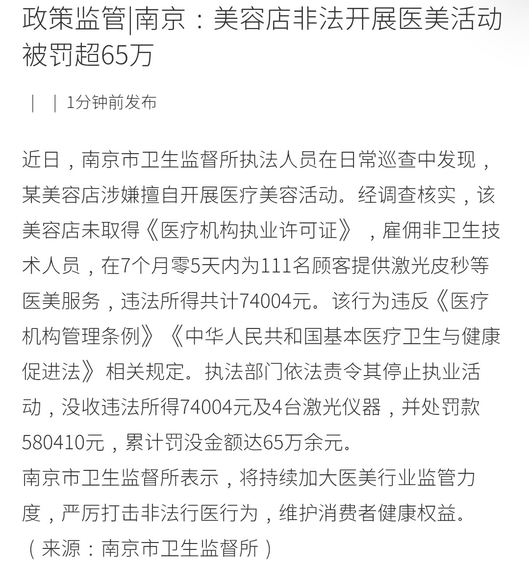 今年1月南京市执法部门还查处了一起美容店非法开展医美活动案件累计罚没金额达65万余元。