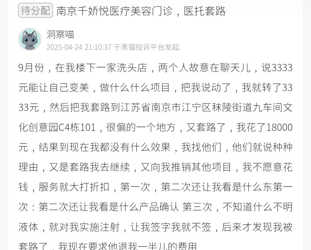 消费者一旦提出退款诉求涉及的医美机构往往以项目已操作完成效果无异常等理由拒绝或通过更换院区变更法人等手段模糊责任主体。千娇悦关联投诉中消费者描述的39800元承诺两次只做一次后续复诊多次更换院区以及机构方直接失联等情节均符合渠道医美纠纷中常见的处理模式。
