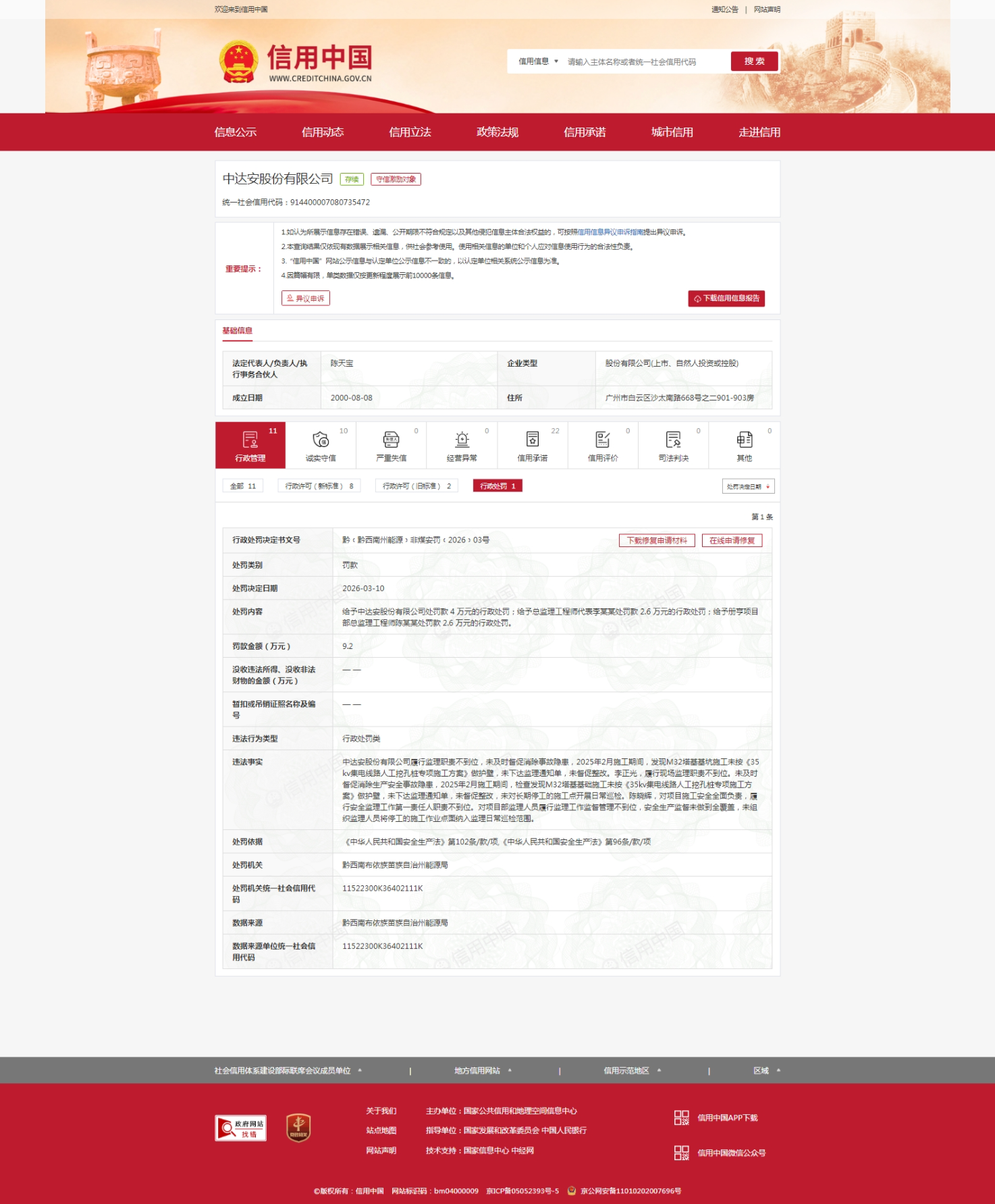齐鲁晚报·齐鲁壹点记者于信用中国行政处罚栏获悉,3月10日,中达安(300635.SZ)因“履行监理职责不到位,未及时督促消除事故隐患”等被行政处罚,处罚机关是黔西南布依族苗族自治州能源局。