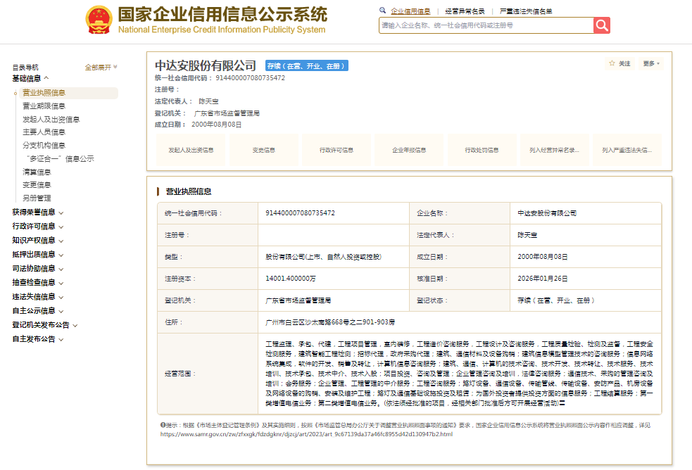 国家企业信用信息公示系统显示,中达安股份有限公司成立于2000年,注册资本14001.4万元人民币,法定代表人为陈天宝。