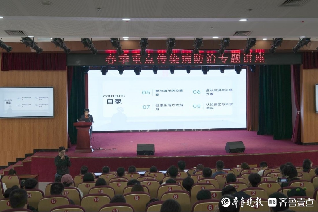 4月16日,菏泽职业学院举办春季重点传染病科学预防专题讲座,菏泽市第六人民医院主任医师王君受邀主讲,各系部师生代表到场参与。