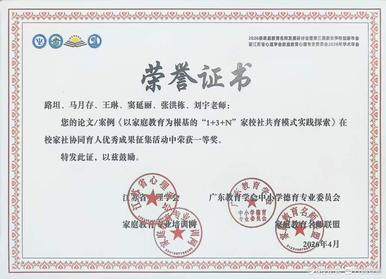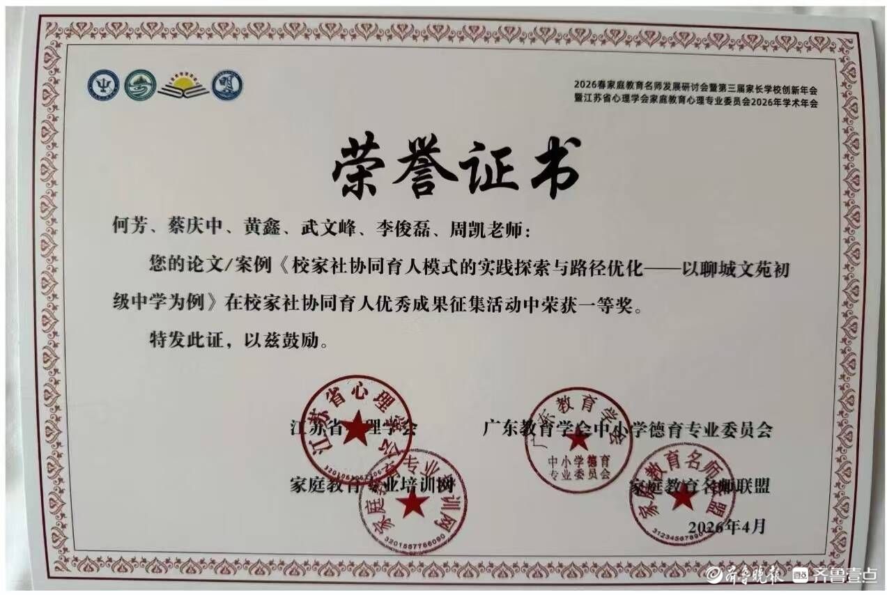 4月16日至18日,2026年春季家庭教育名师发展研讨会暨第三届家长学校创新年会在江苏苏州举行。大会聚焦基础教育改革与家庭教育使命担当,面向全国征集校家社协同育人创新实践成果。聊城市东昌府区选送的聊城市实验中学、文苑初级中学两项育人成果,在全国174个申报项目中脱颖而出,双双斩获一等奖,集中展现了东昌府区家校社协同育人工作的扎实成效与深厚积淀。