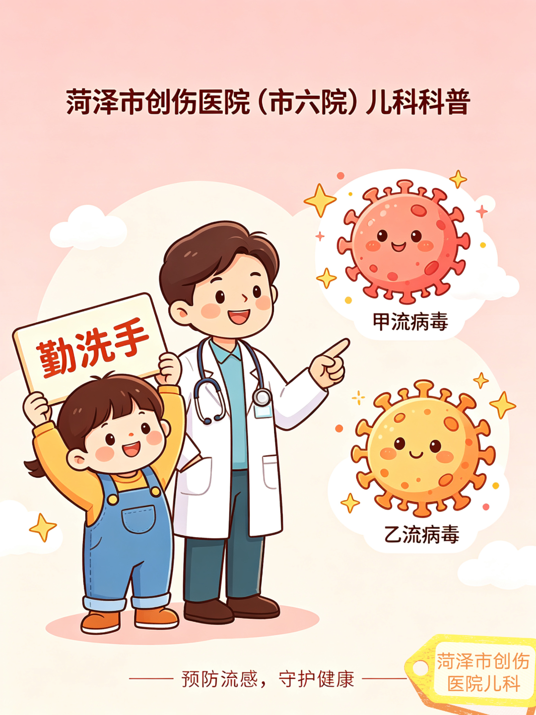 流感可防可治,无需恐慌,但切勿轻视。年前甲流、年后乙流是季节规律,家长做好防护、早识别、早治疗,就能最大程度保护孩子。若孩子出现发热、咳嗽、浑身酸痛等症状,及时到菏泽市创伤医院(市六院)儿科就诊,早干预、少受罪。