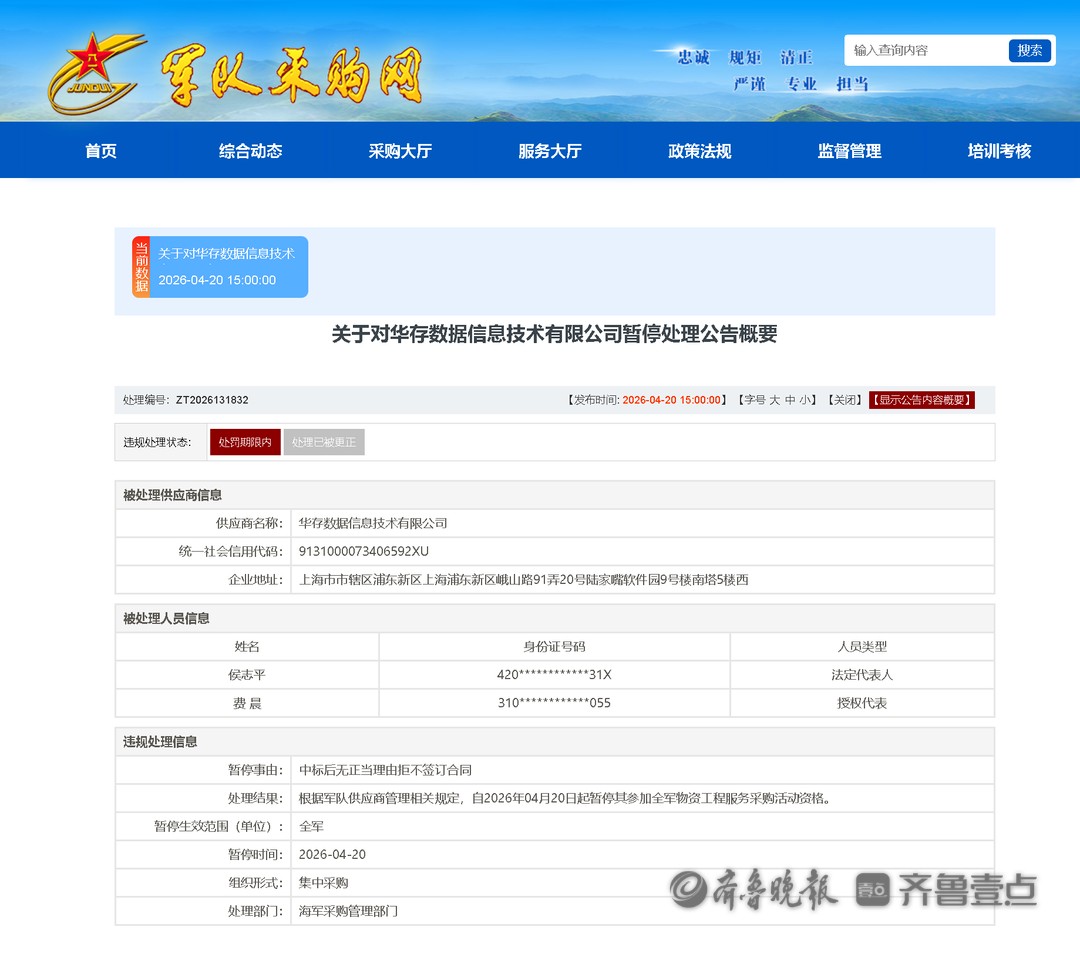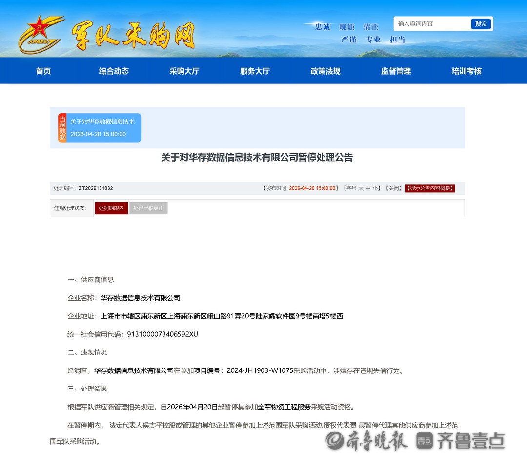4月20日,军队采购网发布关于对华存数据信息技术有限公司(下称“华存数据”)暂停处理公告。