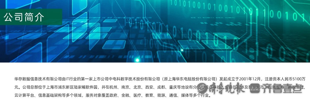 华存数据由IT行业的第一家上市公司中电科数字技术股份有限公司(电科数字 600850.SH)发起成立于2001年12月,注册资本人民币5100万元。公司总部位于上海市浦东新区陆家嘴软件园,并在杭州、南京、北京、西安、成都、重庆等地设有分公司或办事处。业务范围涉及智慧城市、智能应用、数据治理、云计算平台、信息基础架构等多个领域,服务对象覆盖政府、金融、医疗、教育、能源、通信、媒体等多个行业。