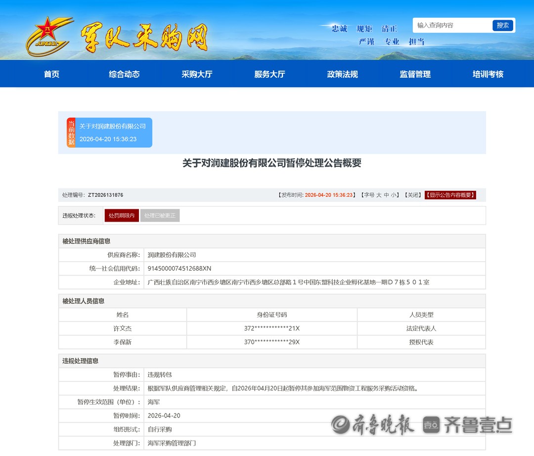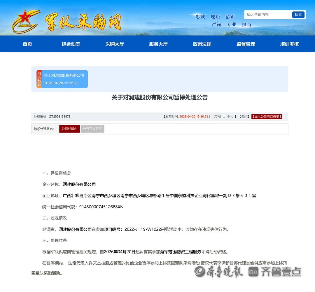 4月20日,军队采购网发布关于对润建股份有限公司(润建股份 002929.SZ)暂停处理公告。