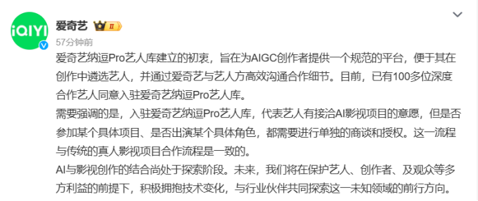随着舆论不断发酵,爱奇艺对“AI艺人库”进行了回应。爱奇艺在回应中称,爱奇艺纳逗Pro艺人库建立的初衷,旨在为AIGC创作者提供一个规范的平台,便于其在创作中遴选艺人,并通过爱奇艺与艺人方高效沟通合作细节。目前,已有100多位深度合作艺人同意入驻爱奇艺纳逗Pro艺人库。