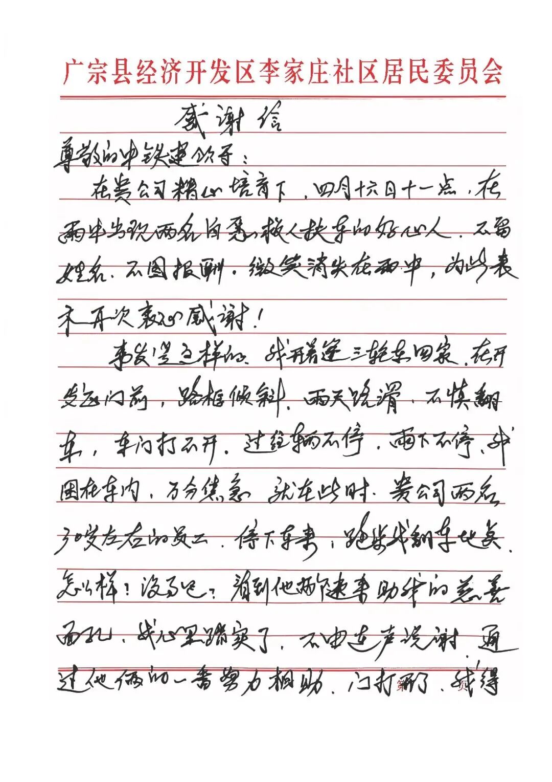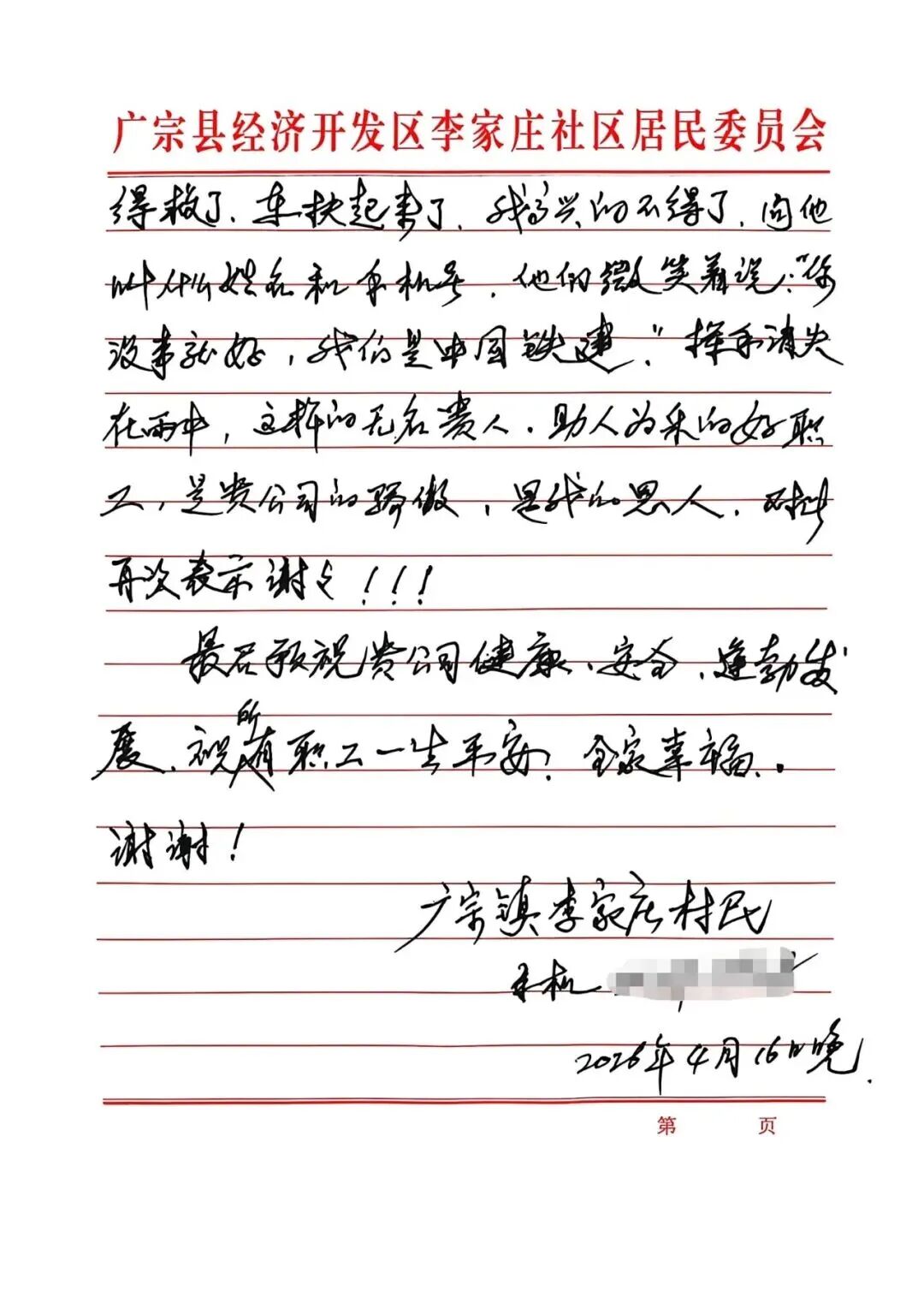 4月17日上午,中国铁建港航局广宗县地下水水资源置换工程项目部院子里,一位白发老人紧攥着手写感谢信,泛红的眼眶里满是劫后余生的感激。项目部的年轻小伙们面面相觑,谁也不知道发生了什么。