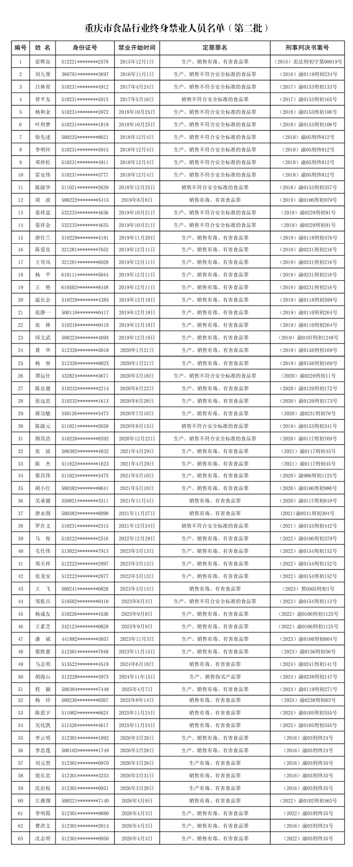 重庆公布第二批食品行业禁业人员名单,其中63人被终身禁业