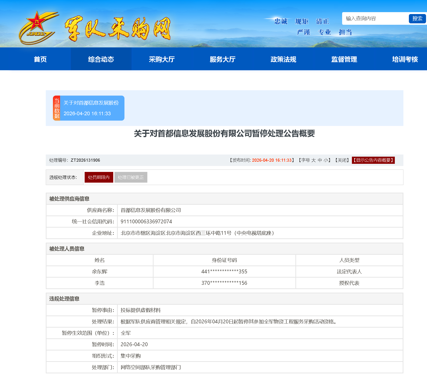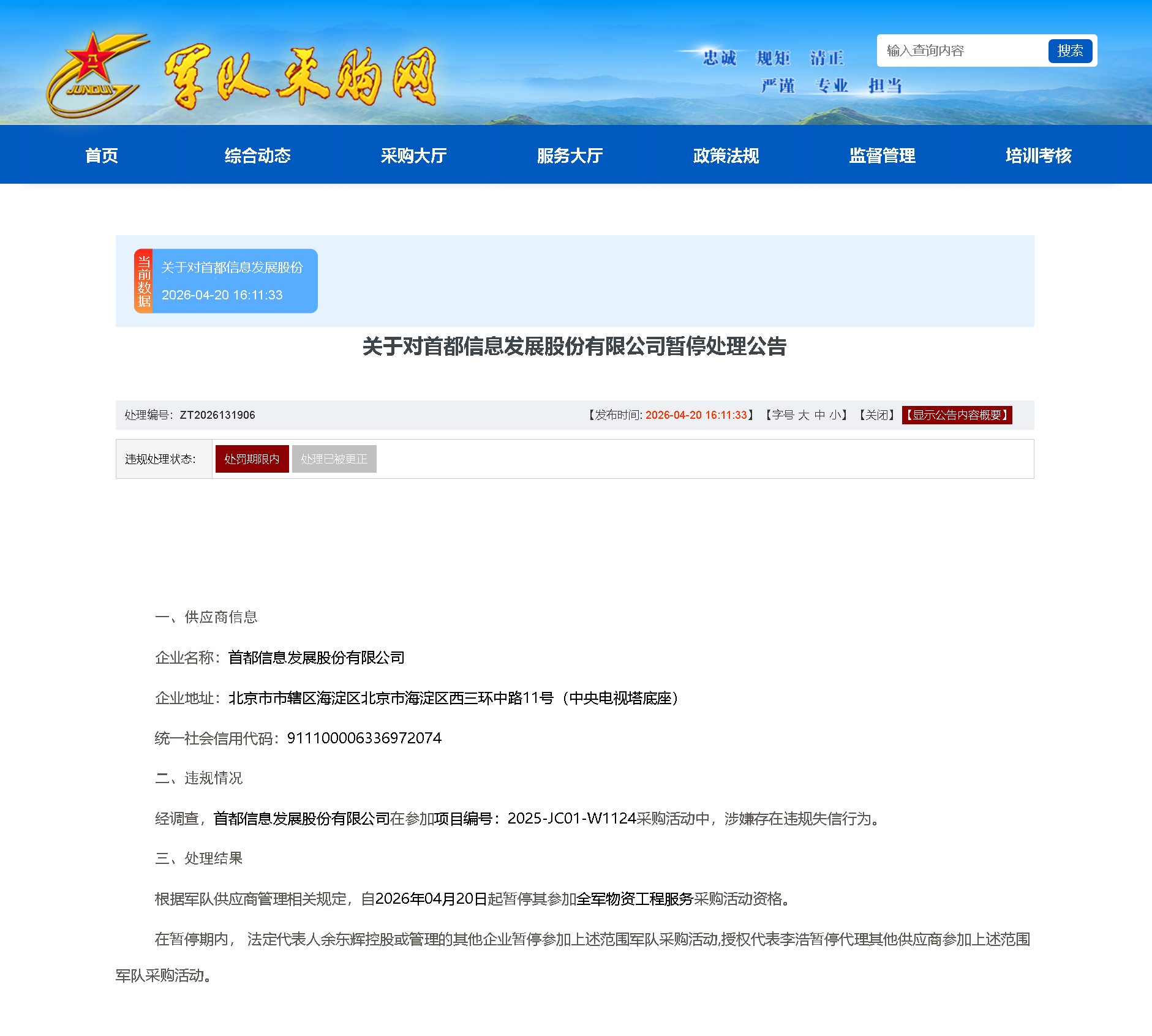 首都信息被暂停参加全军物资工程服务采购活动资格
