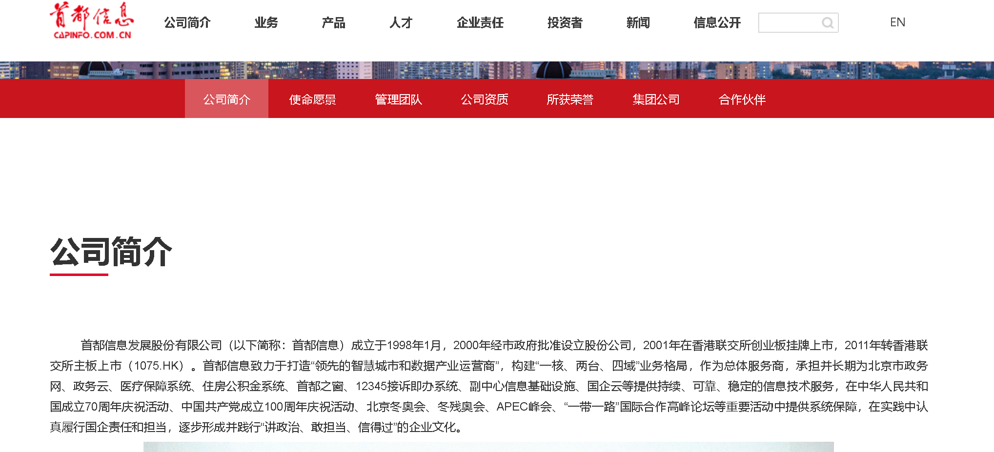 首都信息发展股份有限公司(以下简称:首都信息)成立于1998年1月,2000年经市政府批准设立股份公司,2001年在香港联交所创业板挂牌上市,2011年转香港联交所主板上市(1075.HK)。
