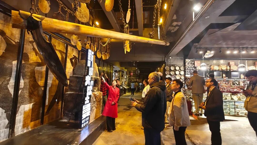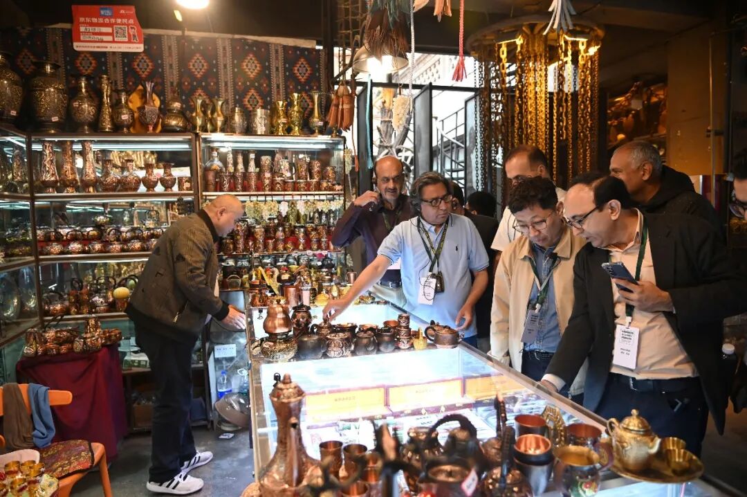 4月19日,“巴基斯坦媒体智库人士中国行”参访团在喀什古城坎土曼巴扎铁业公社参观“新疆最大的坎土曼”及特色手工艺品。喀什地区融媒体中心 记者任鹏程 摄