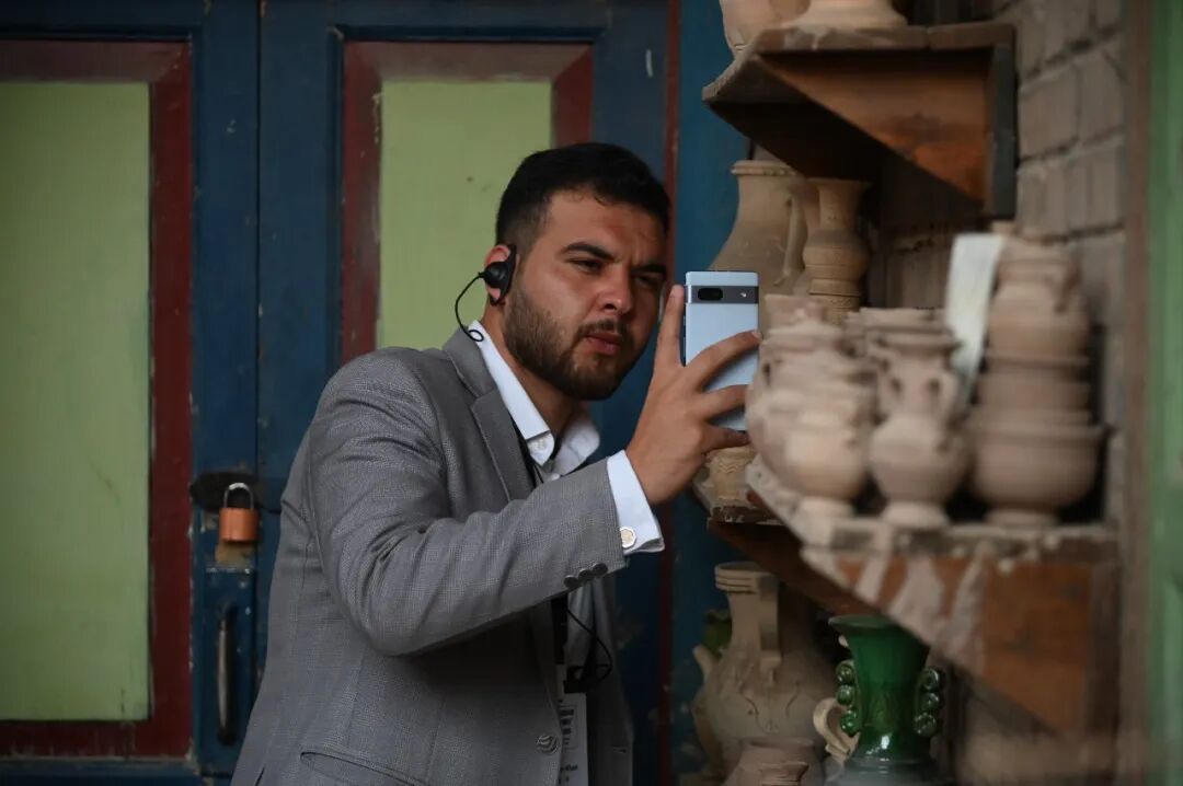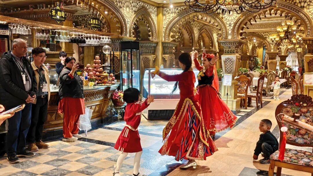 4月19日,“巴基斯坦媒体智库人士中国行”参访团成员拍摄各族群众载歌载舞场景。喀什地区融媒体中心 记者任鹏程 摄