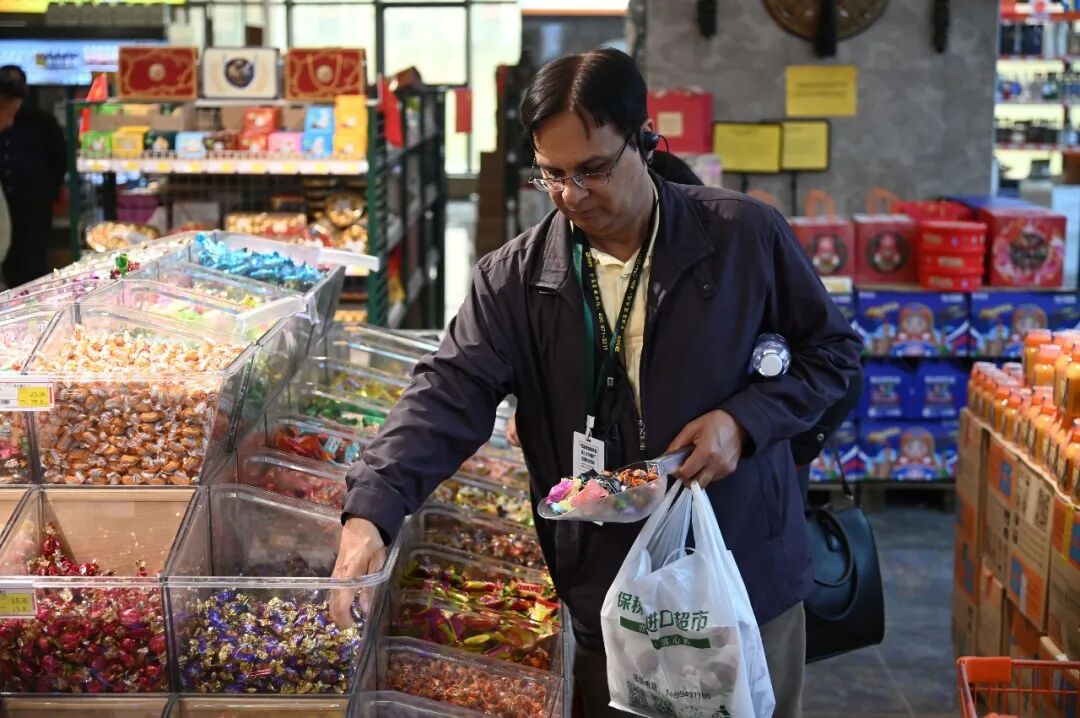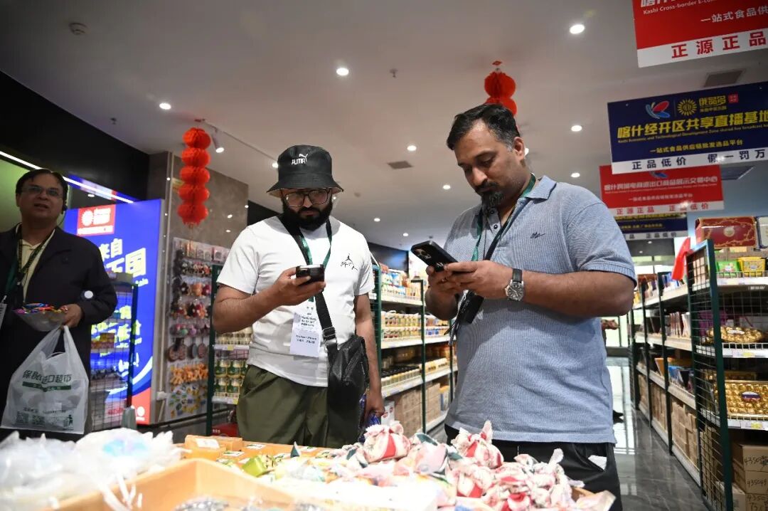 4月19日,“巴基斯坦媒体智库人士中国行”参访团在喀什跨境电商进出口商品展示交易中心,实地感受跨境贸易活力。喀什地区融媒体中心 记者任鹏程 摄