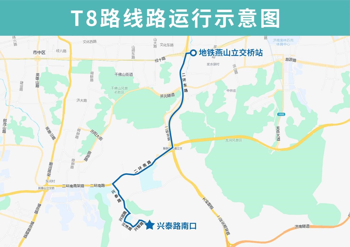 T8路由兴泰路南口开往地铁燕山立交桥站,主要途经兴泰路、兴智路、兴泽路、兴润路、兴泰路、二环南路、老虎山隧道、二环东路、经十路,沿途设置兴泰路南口、兴智路兴泰路(路西)、兴泰路兴智路(路南)、泉泽小学、泉泽中学、兴泰路二环南路、兴隆山庄西、山财大燕山校区、地铁燕山立交桥站站点。