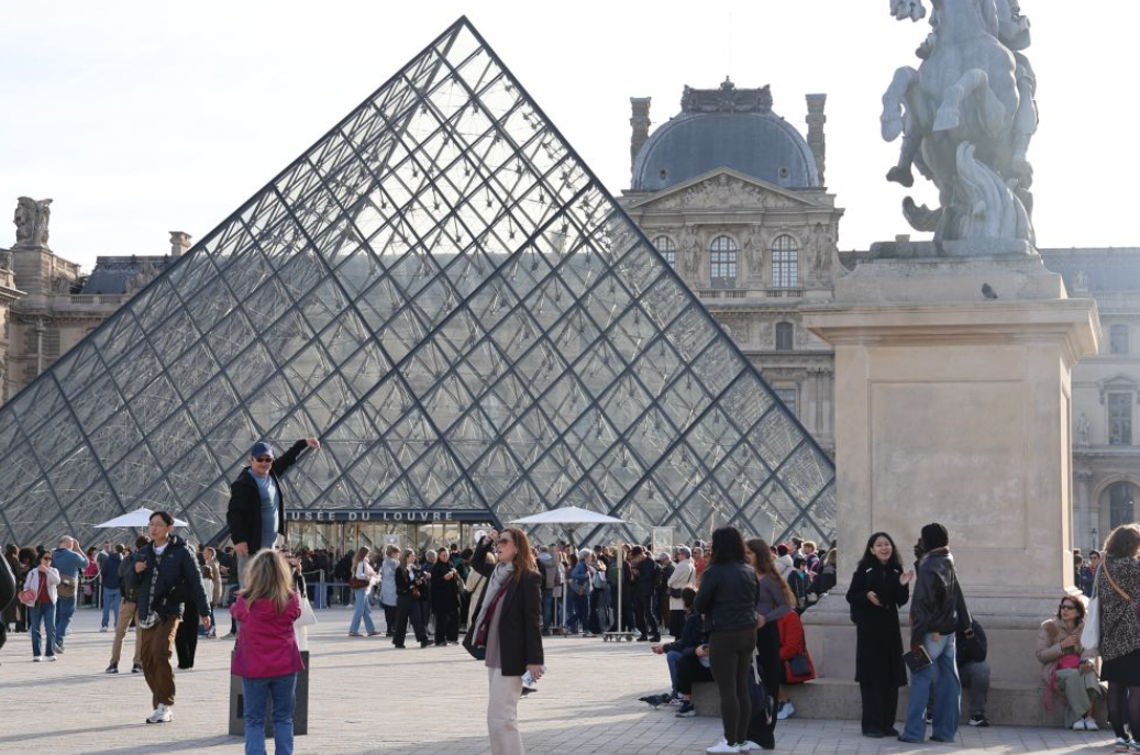2025年10月22日,在法国巴黎,大量游客聚集在卢浮宫博物馆的玻璃金字塔入口前。图源:新华社