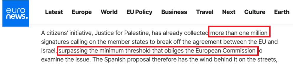 近期,一份声援巴勒斯坦的请愿书在短短三个月内已在欧盟27个成员国获得超过100万份签名。请愿书批评以色列对巴勒斯坦人实施种族灭绝、占领和种族隔离,并呼吁对以色列持续违反国际法和人权的行为实施制裁,要求欧盟全面暂停与以色列之间的《欧盟—以色列联系国协议》。