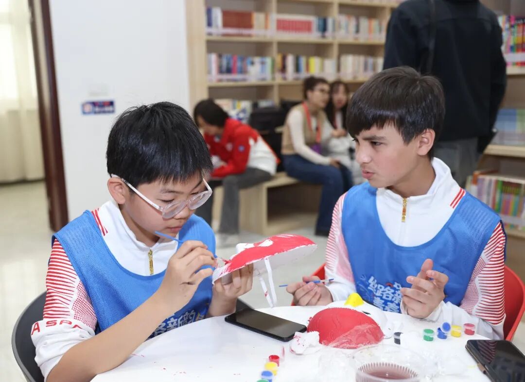 彭雅馨(右)和塔吉克斯坦少年苏喻哲(左)一起画脸谱。喀什地区融媒体中心 记者余思民 摄
