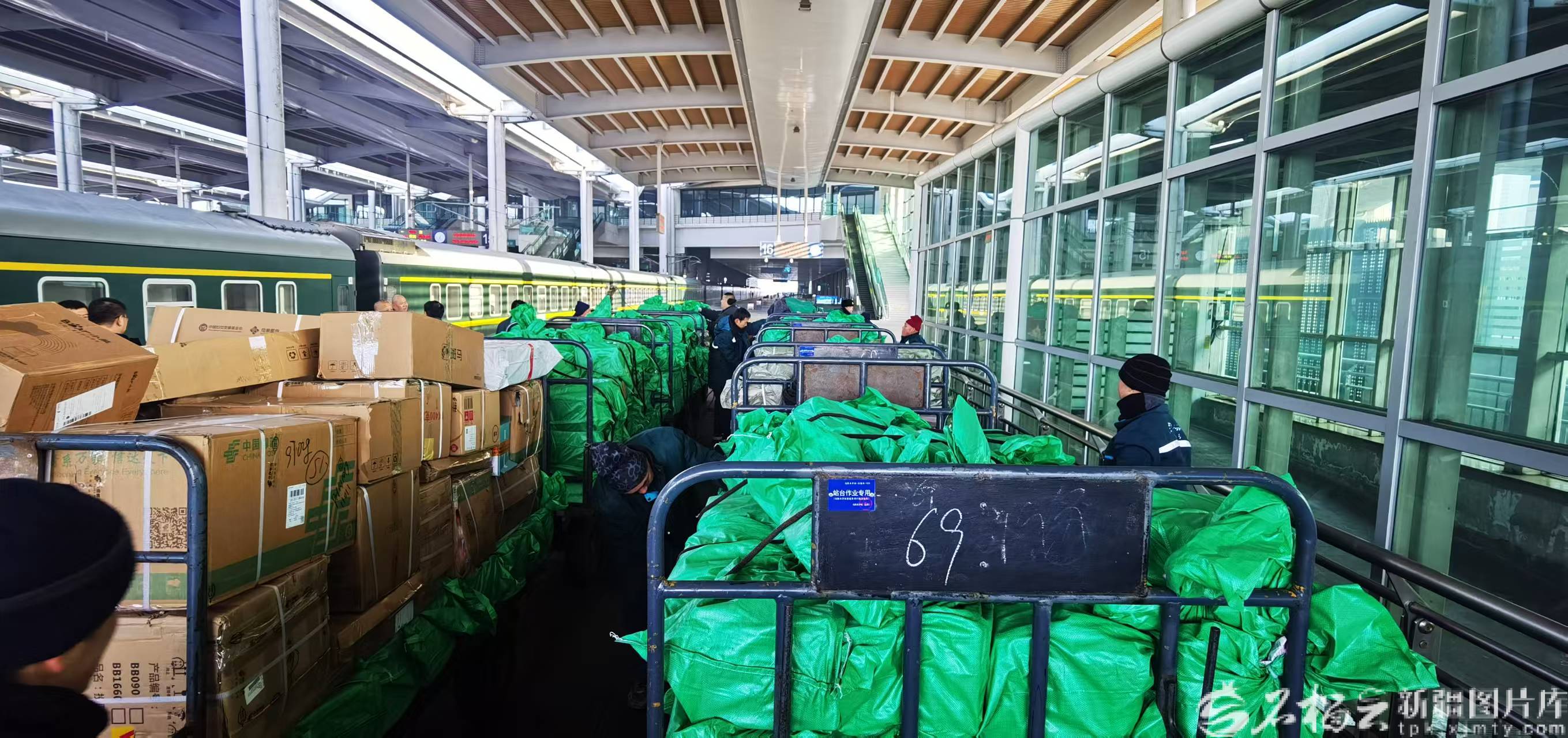 3月20日,乌鲁木齐邮区中心转运人员在乌鲁木齐站站台装运邮件。黄梅供图