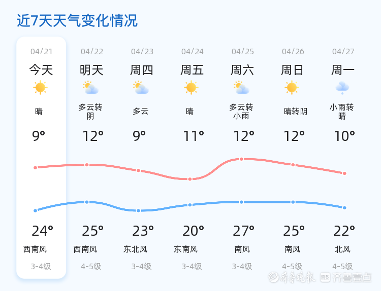 未来三天,烟台市天气趋势为多云为主,气温在9℃至25℃之间波动。周四(4月23日)多云,东北风3-4级;周五(4月24日)晴,气温略有下降,最低气温11℃;周六(4月25日)多云转小雨,气温回升,最高气温27℃,风力3-4级。预计周六将有小雨天气,市民需注意携带雨具,防范降雨对出行的影响。
