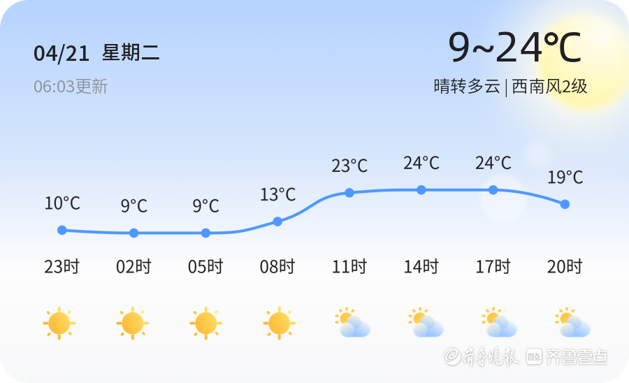 今天是4月21日,星期二,农历三月初五。烟台市今日天气晴转多云,气温较为适宜,当前温度12.5℃,西南风2级,空气湿度24%,空气质量良好(PM2.5指数为72)。各区天气状况基本一致,均为晴转多云,白天气温逐渐回升,夜间温度较低。