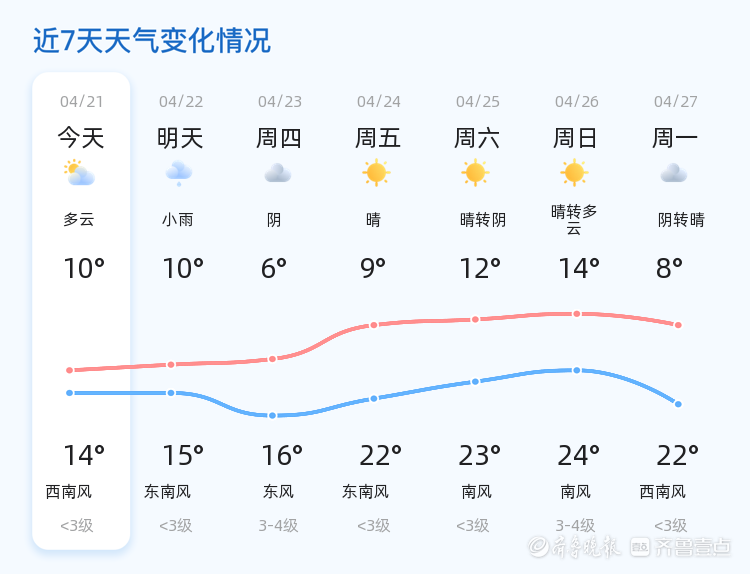 今天是4月21日,星期二,农历三月初五。枣庄市今日天气多云转小雨,气温在10℃至14℃之间,东北风1级,空气湿度为78%,PM2.5指数为86,空气质量良好。各区天气情况基本一致,市民出行请注意携带雨具,防范小雨带来的不便。