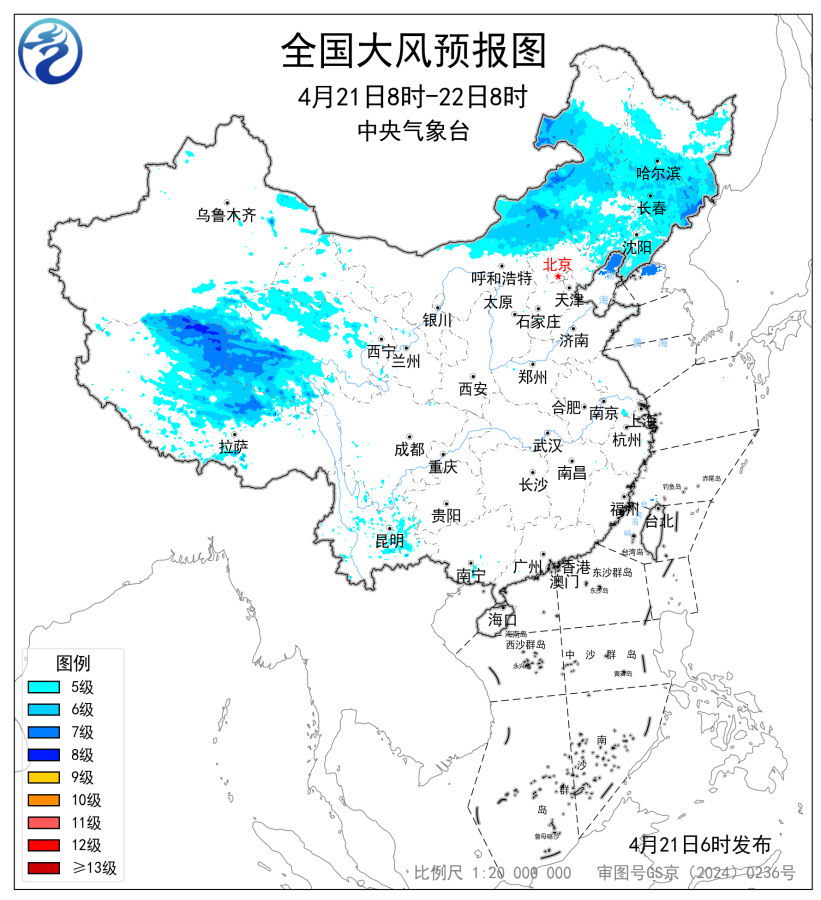 中央气象台4月21日06时继续发布大风蓝色预警:预计,4月21日8时至22日8时,内蒙古中东部、黑龙江中南部、吉林、辽宁以及新疆南疆盆地、西藏北部、青海西部等地部分地区有5~7级风,阵风8~9级,渤海北部海域、黄海北部海域将有7级、阵风8级的风。