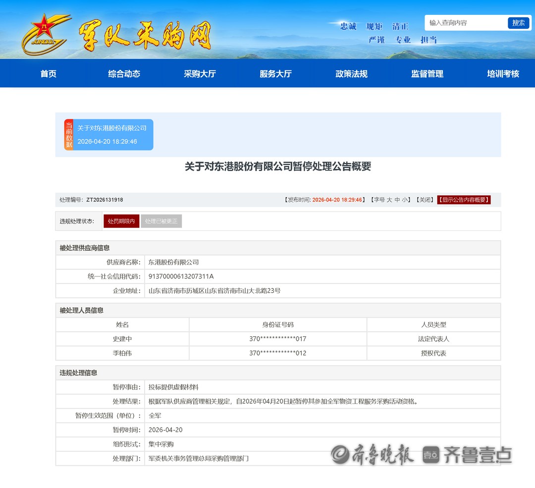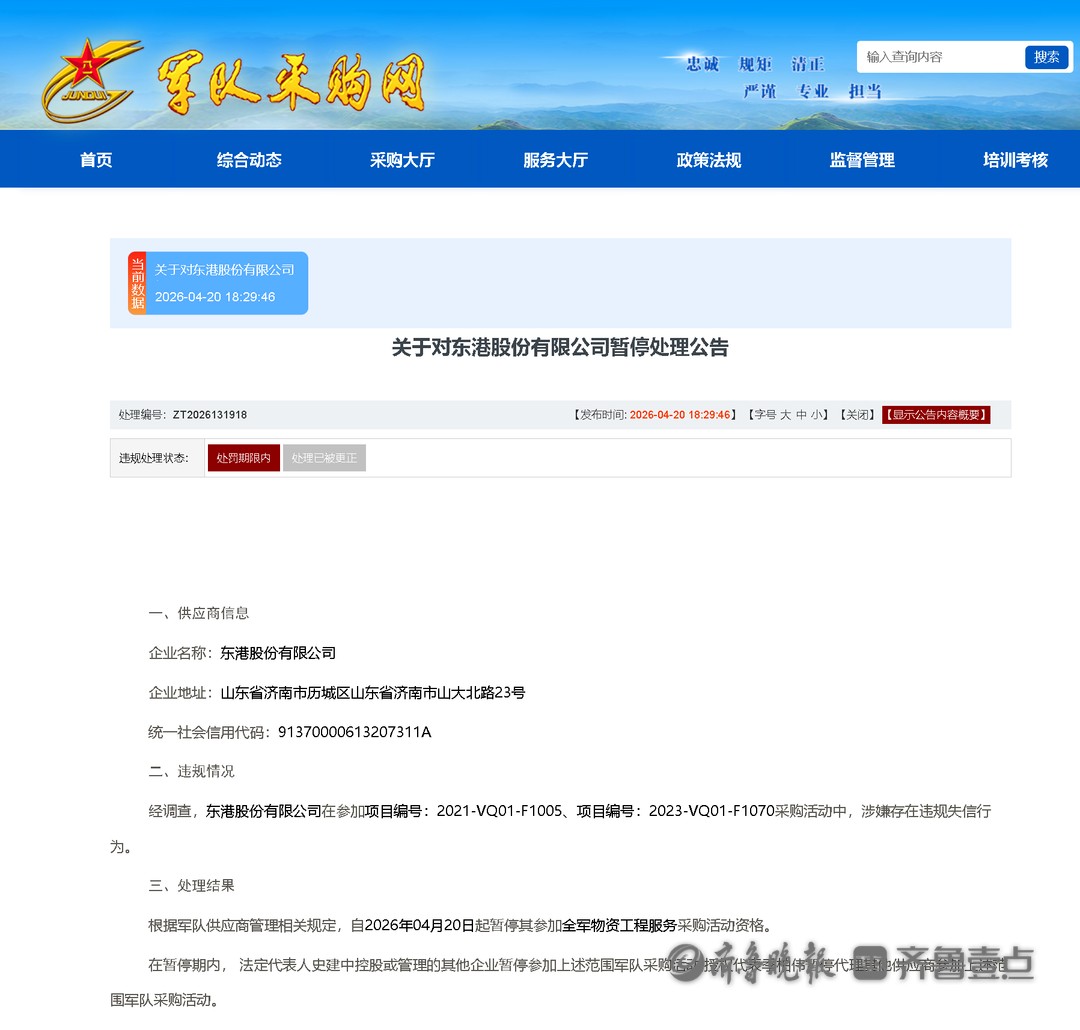 4月20日,军队采购网发布关于对东港股份有限公司(东港股份 002117.SZ)暂停处理公告。