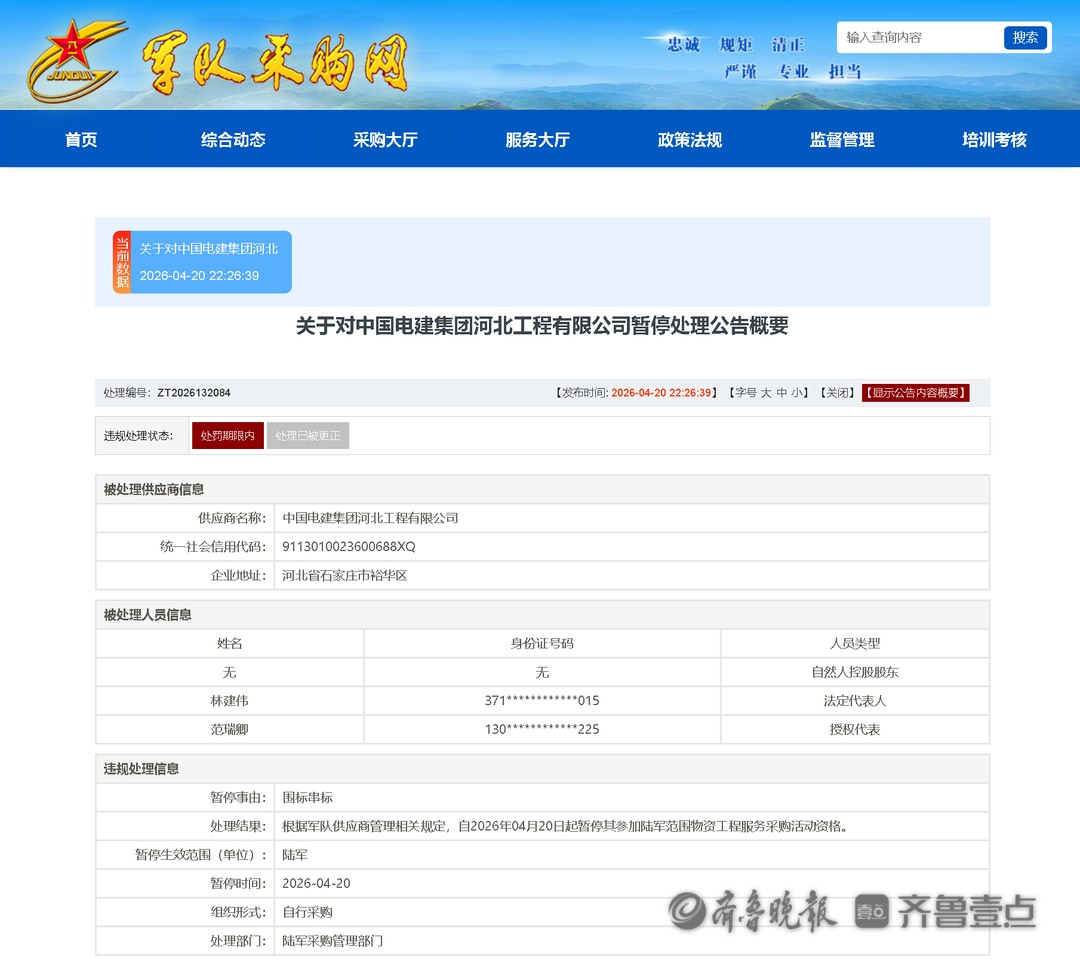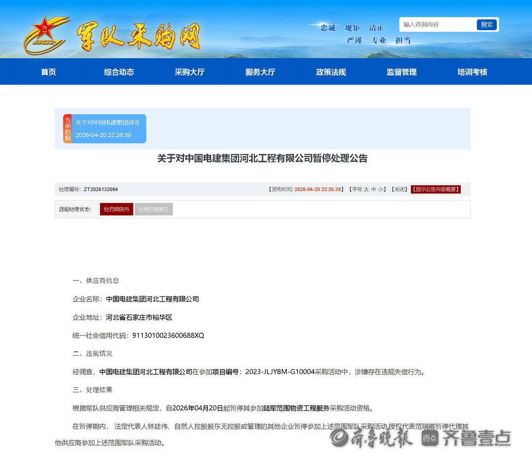 4月20日,军队采购网发布关于对中国电建集团河北工程有限公司暂停处理公告。