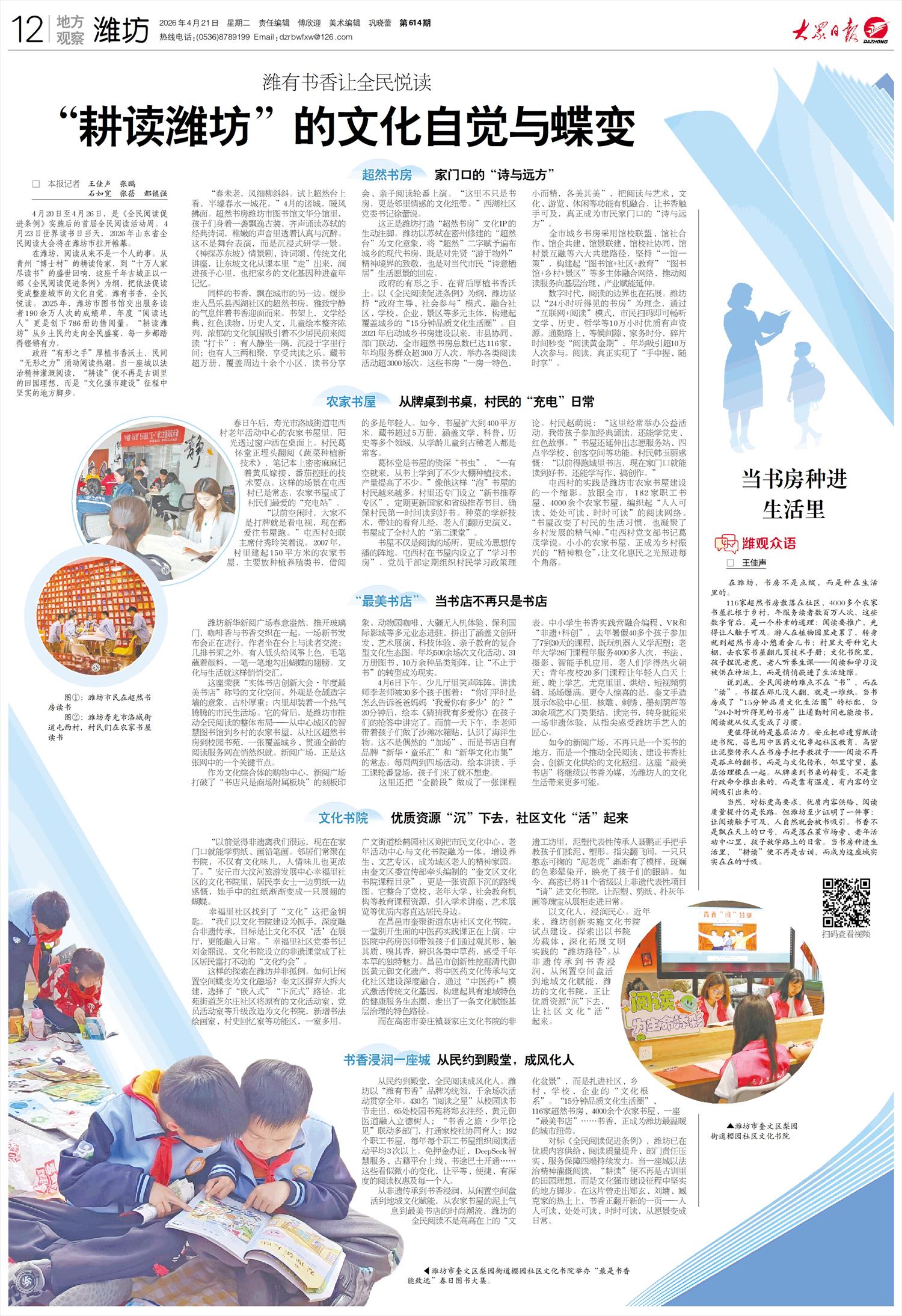 当然,对标更高要求,优质内容供给、阅读质量提升仍是长路。但潍坊至少证明了一件事:让阅读触手可及,人自然就会被书吸引。书香不是飘在天上的口号,而是落在菜市场旁、老年活动中心里、孩子放学路上的日常。当书房种进生活里,“耕读”便不再是古训,而成为这座城实实在在的呼吸。