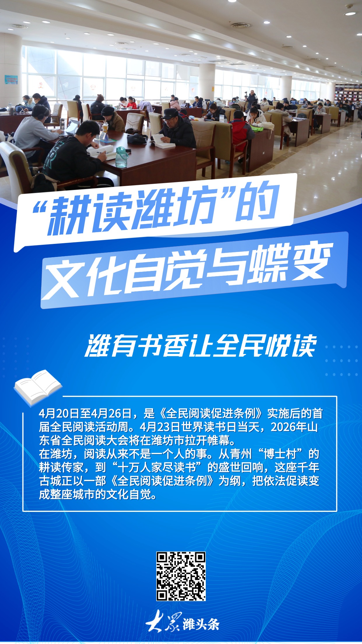 4月20日至4月26日,是《全民阅读促进条例》实施后的首届全民阅读活动周。4月23日世界读书日当天,2026年山东省全民阅读大会将在潍坊市拉开帷幕。