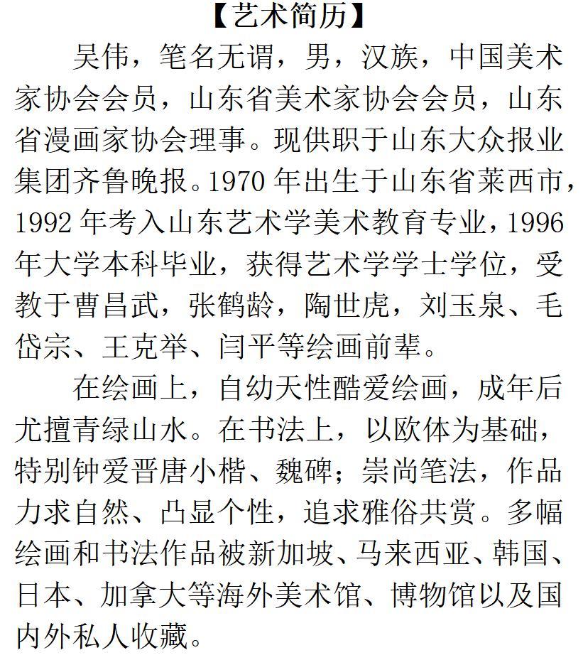在当代画坛的多元图景中,总有一些创作者以独特的艺术语言,在坚守传统与探索创新的道路上步履不停。当代画家吴伟,便是其中极具代表性的一位。身为中国美术家协会会员、山东美术家协会会员、山东省漫画家协会理事,他以笔为媒,以心为舟,在水墨丹青与漫画艺术的交融之路上不断深耕,用作品勾勒时代风貌,用线条传递内心真情,构建起独属于“无谓”的艺术境界。