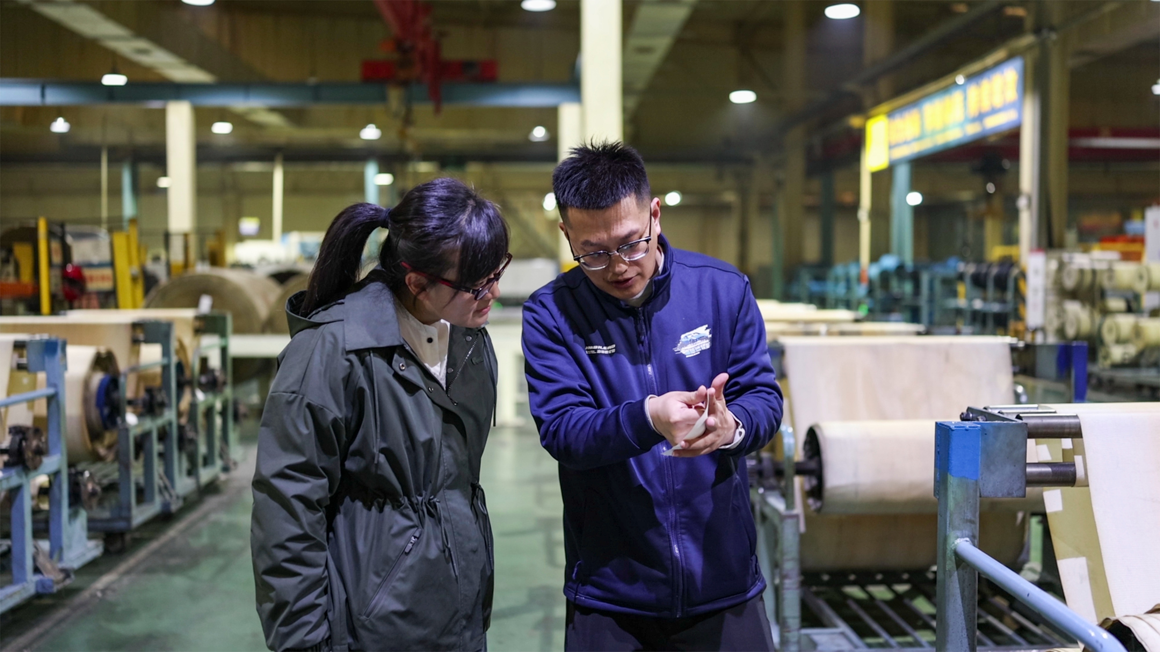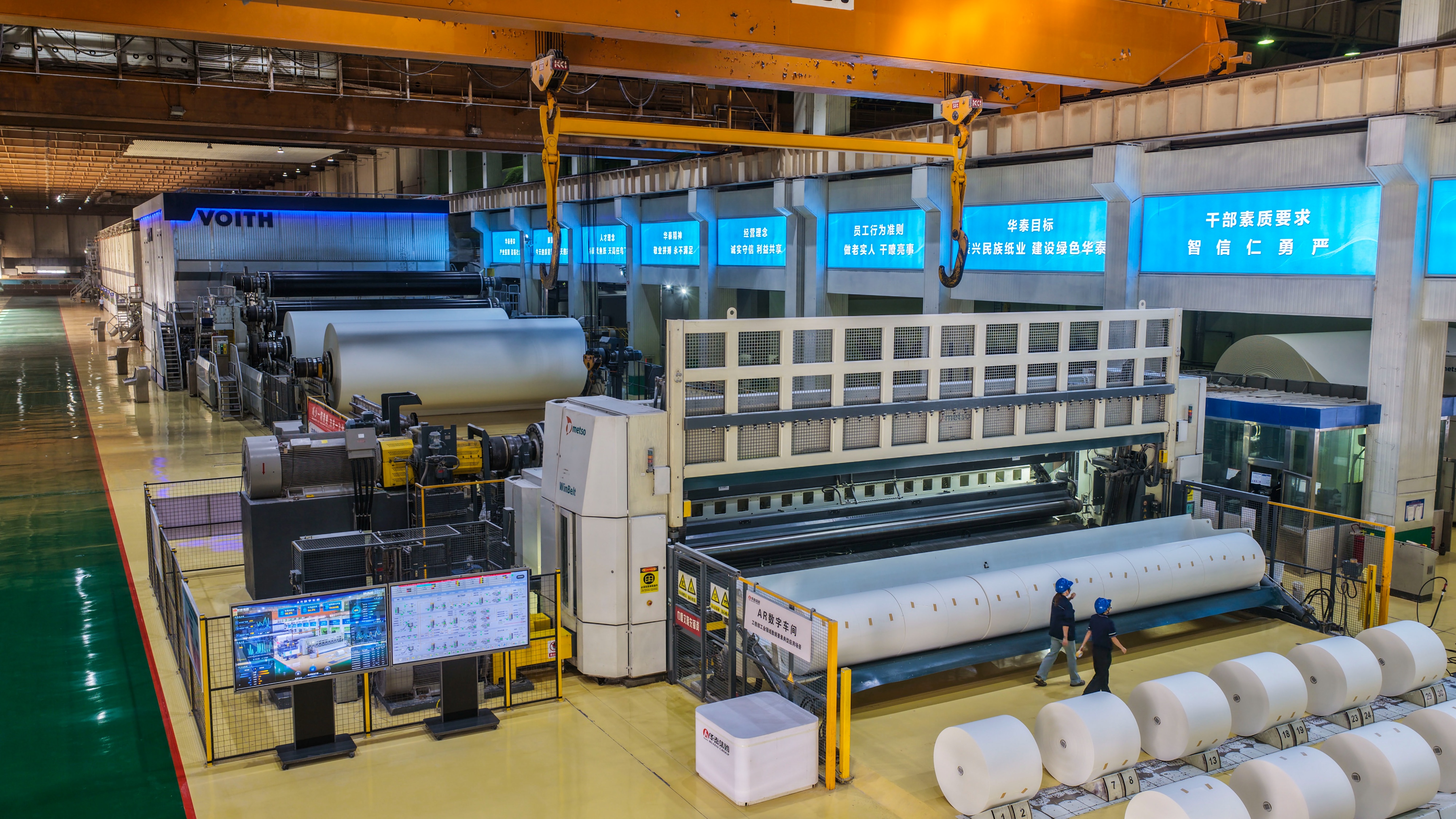在华泰集团有限公司AR数字车间,车间工人正在生产双胶纸产品。