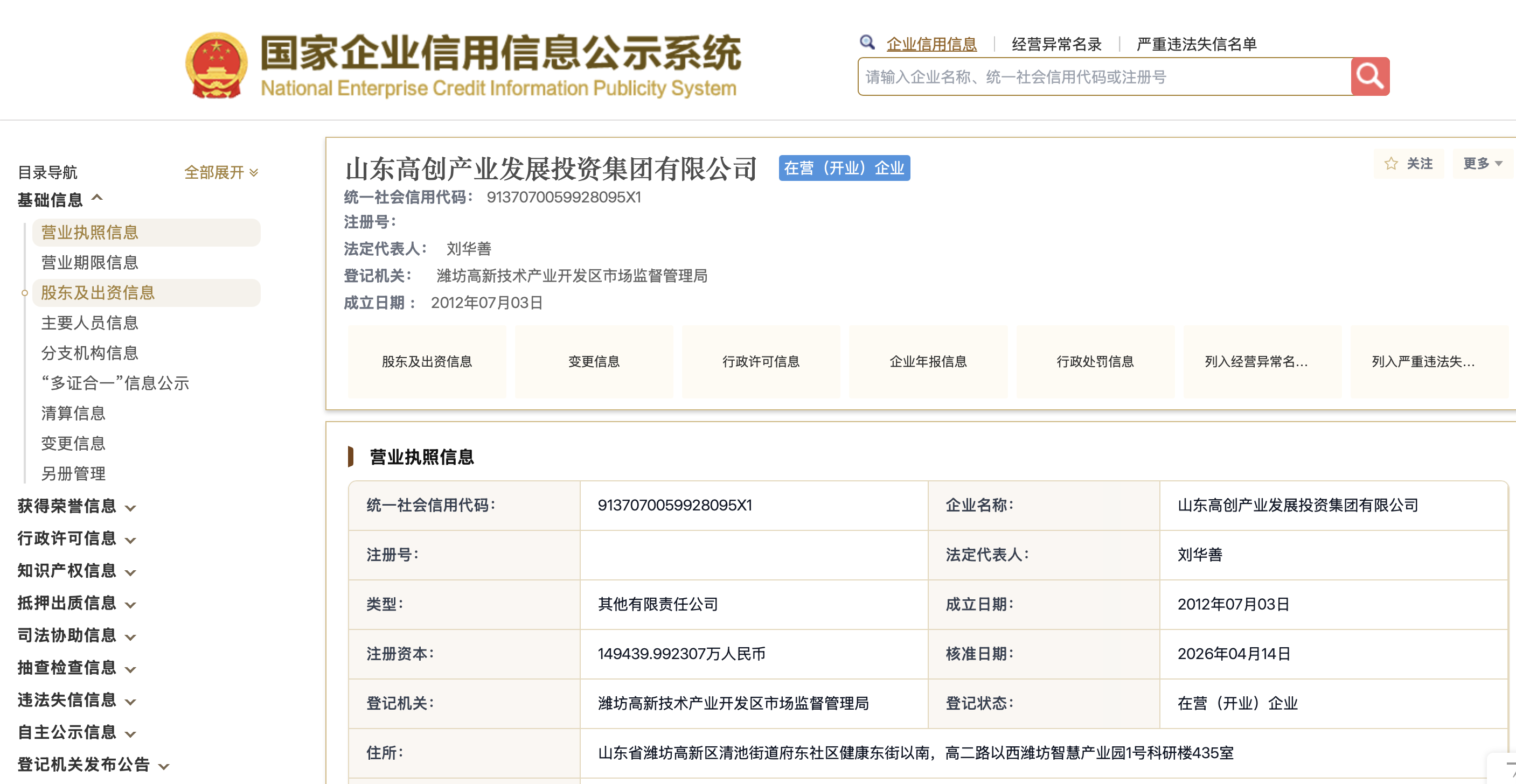 潍坊高新国企山东高创产投股权变动,注册资本同步增加12.59亿元