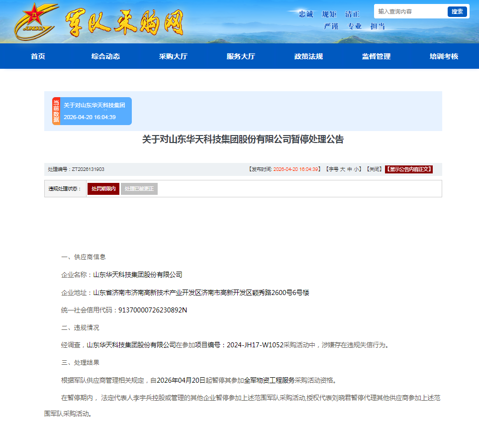 4月20日,军队采购网发布关于对山东华天科技集团股份有限公司暂停处理公告,处理编号:ZT2026131903显示,经调查,山东华天科技集团股份有限公司在参加项目编号:2024-JH17-W1052采购活动中,涉嫌存在违规失信行为。根据军队供应商管理相关规定,自2026年4月20日起暂停其参加全军物资工程服务采购活动资格。在暂停期内, 法定代表人李宇兵控股或管理的其他企业暂停参加上述范围军队采购活动,授权代表刘晓君暂停代理其他供应商参加上述范围军队采购活动。