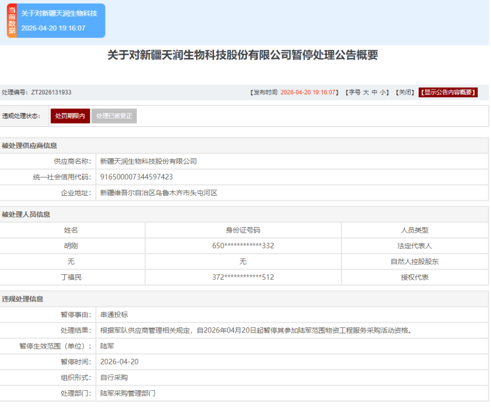 4月20日,军队采购网发布处理公告,新疆天润生物科技股份有限公司在参加军队采购活动中,涉嫌串通投标,根据军队供应商管理相关规定,自2026年04月20日起暂停其参加陆军范围物资工程服务采购活动资格。