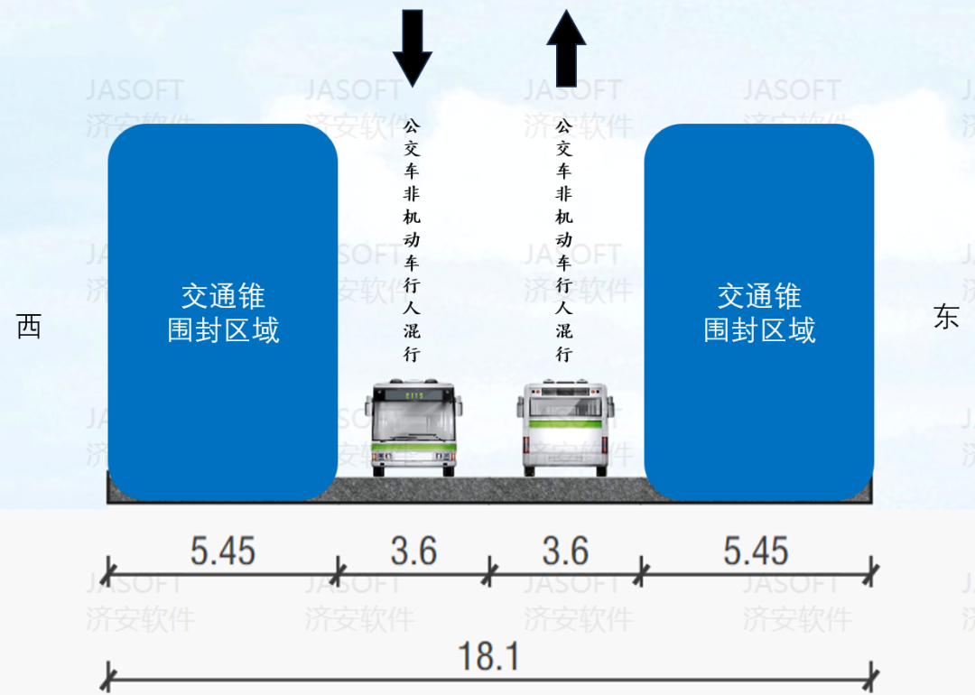 工程采用全天施工模式,分三个阶段推进施工,作业区全天围挡施工,具体通行方案如下: